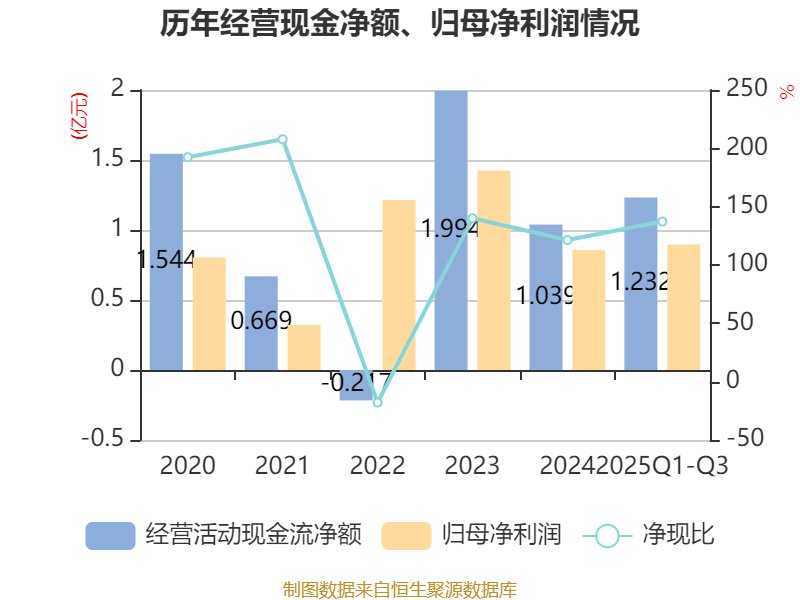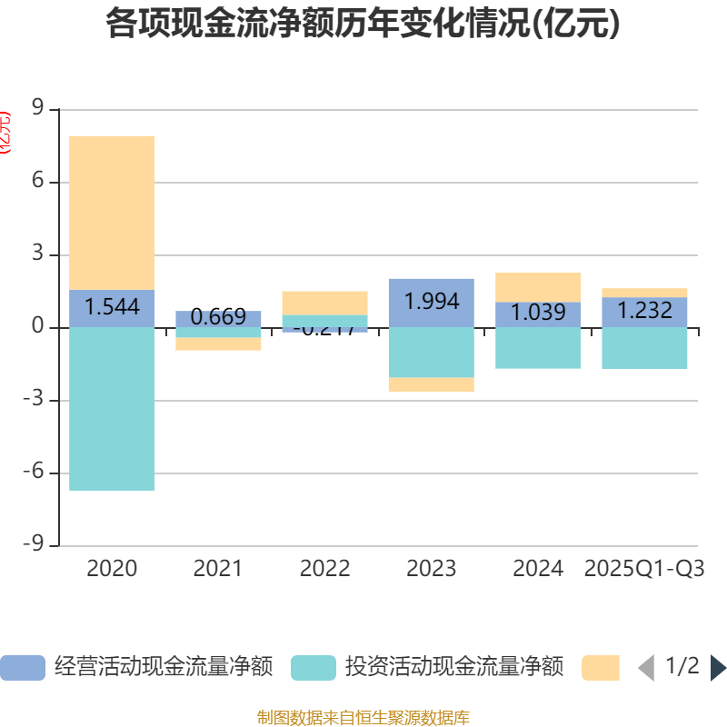 2025年前三季度,公司经营活动现金流净额为1.23亿元,同比增长577.97%;筹资活动现金流净额3731.86万元,同比减少656.86万元;投资活动现金流净额-1.73亿元,上年同期为-4048.45万元。