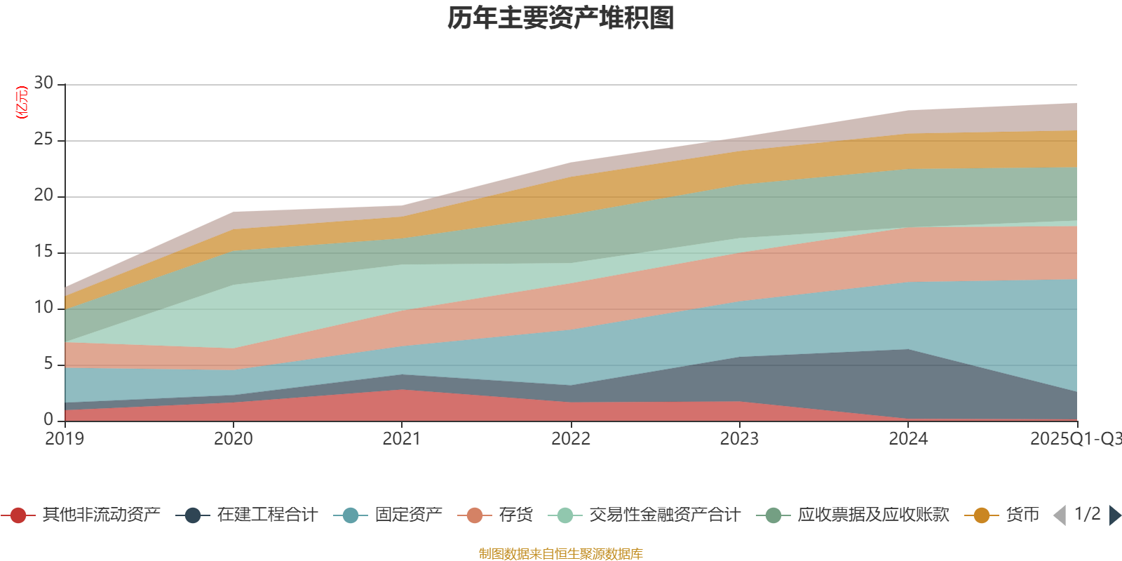 资产重大变化方面,截至2025年三季度末,公司固定资产较上年末增加67.69%,占公司总资产比重上升13.81个百分点;在建工程合计较上年末减少60.42%,占公司总资产比重下降13.76个百分点;应收票据及应收账款较上年末减少8.7%,占公司总资产比重下降2.04个百分点;交易性金融资产合计占公司总资产的1.77%,上年末为0。
