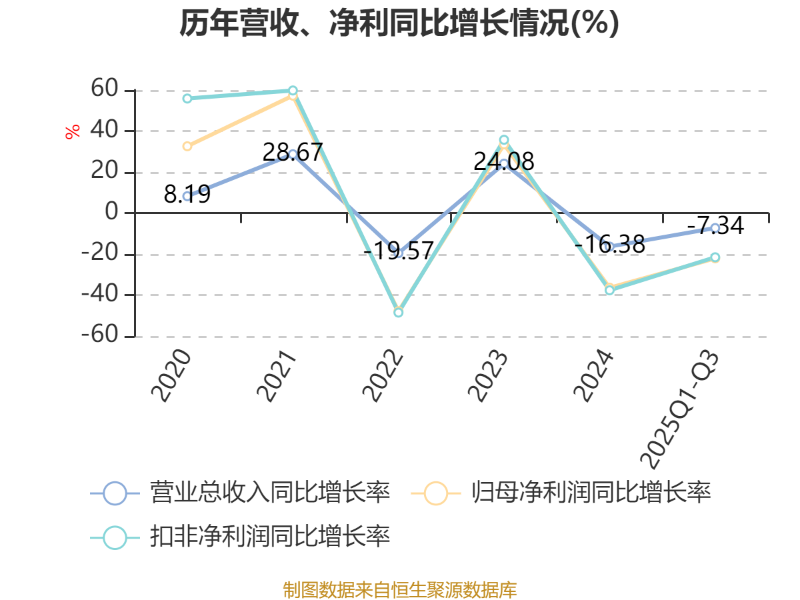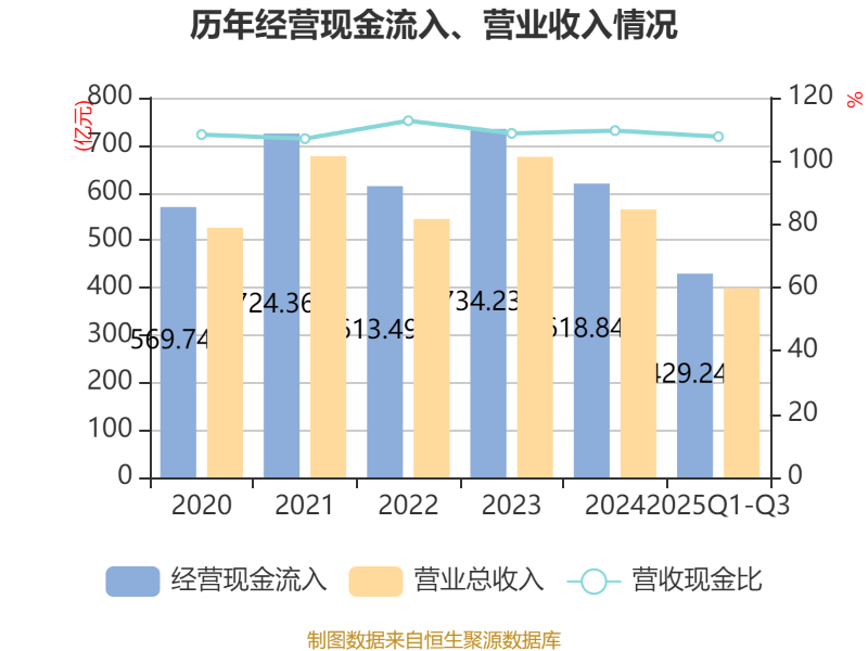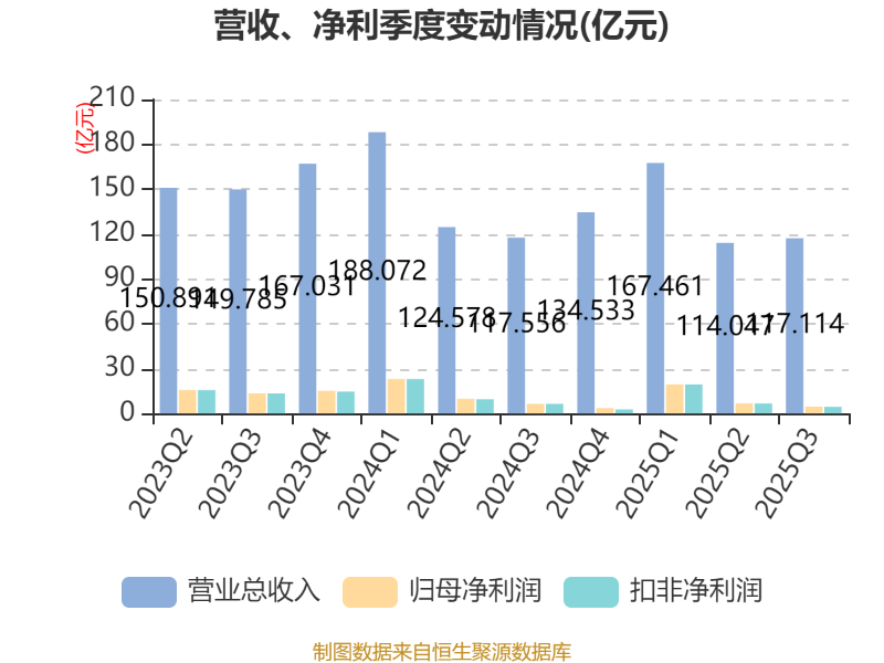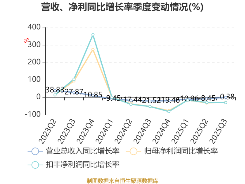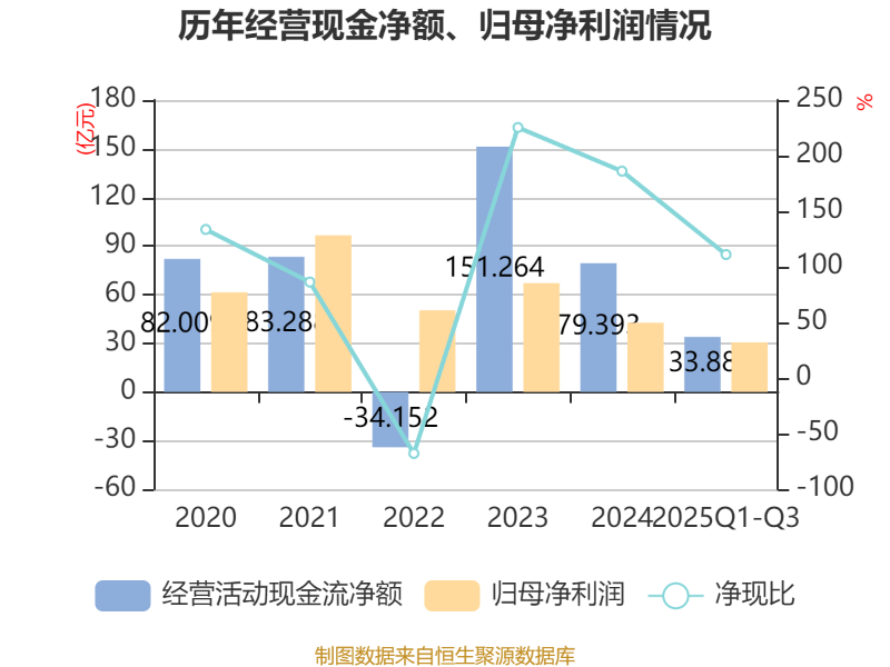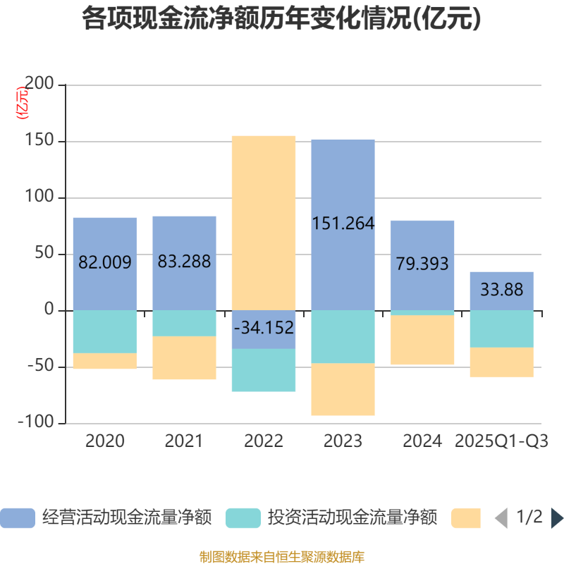2025年前三季度,公司经营活动现金流净额为33.88亿元,同比下降33.62%;筹资活动现金流净额-26.22亿元,同比增加15.1亿元;投资活动现金流净额-33.06亿元,上年同期为-4.09亿元。