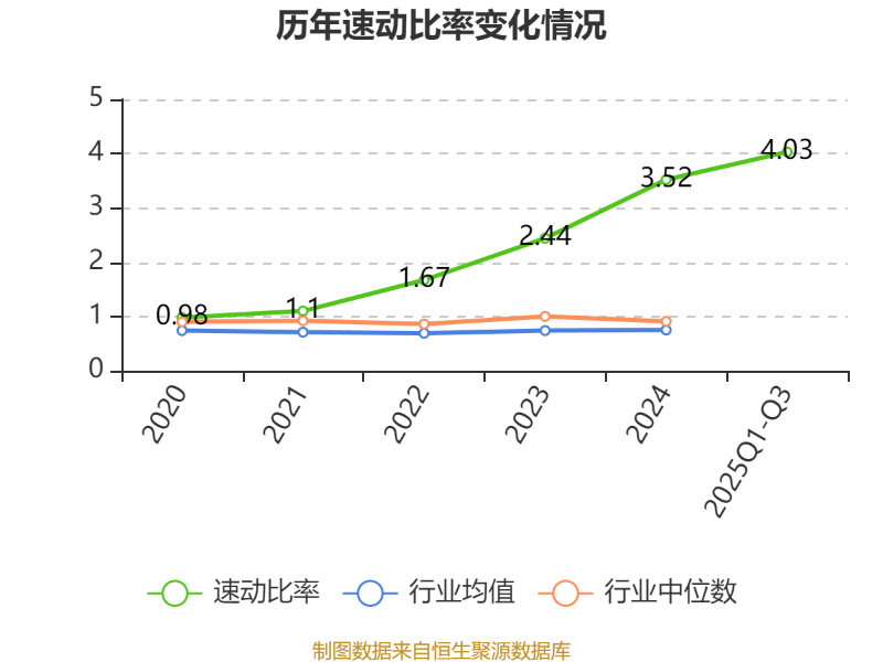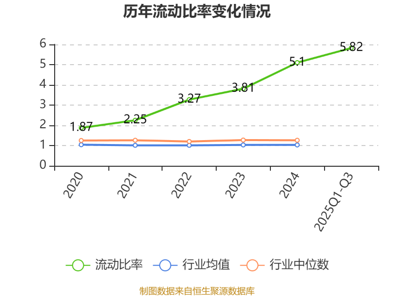 2025年前三季度,公司流动比率为5.82,速动比率为4.03。