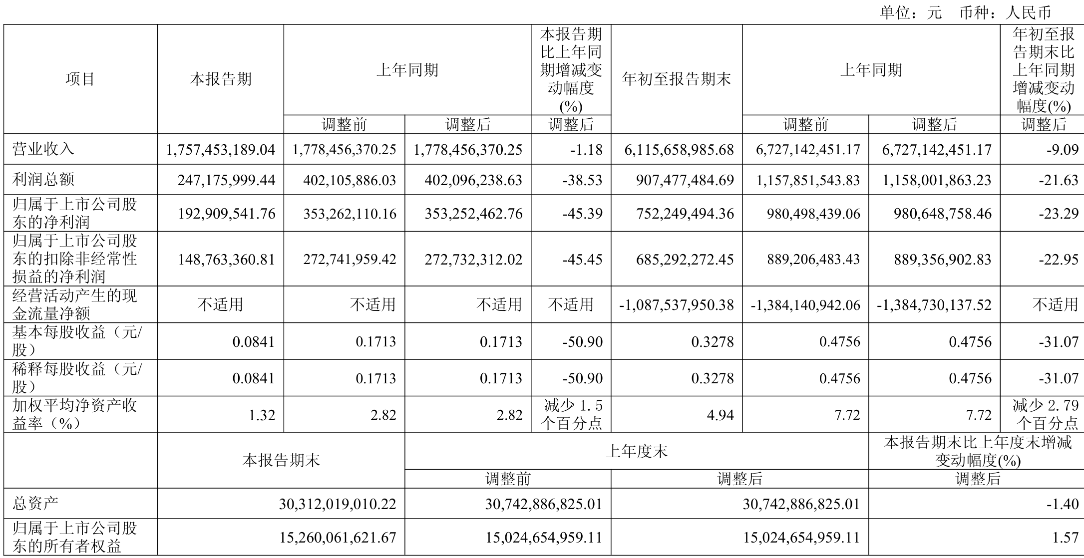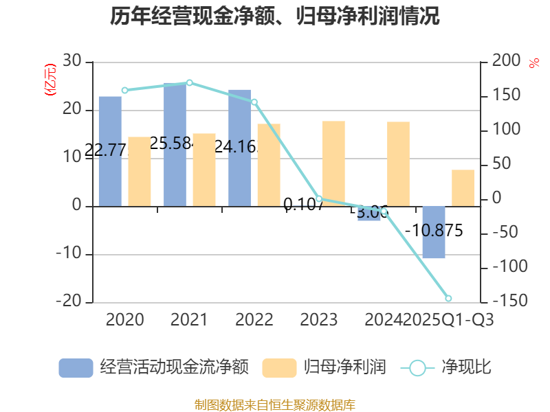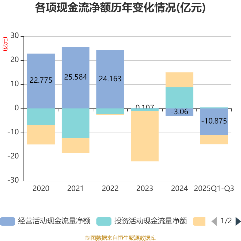 2025年前三季度,公司经营活动现金流净额为-10.88亿元,同比增加2.97亿元;筹资活动现金流净额-4.01亿元,同比减少11.53亿元;投资活动现金流净额4476.15万元,上年同期为4.51亿元。