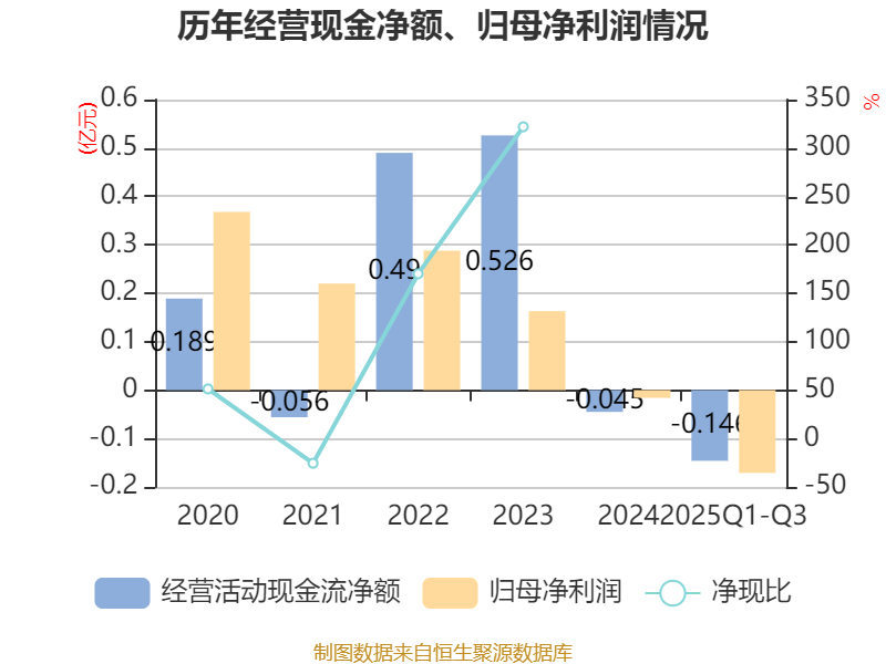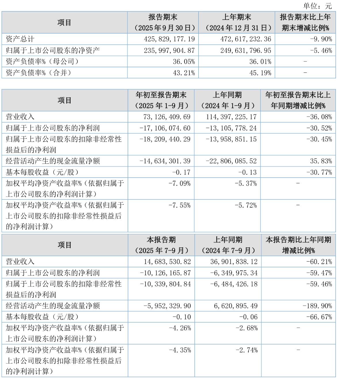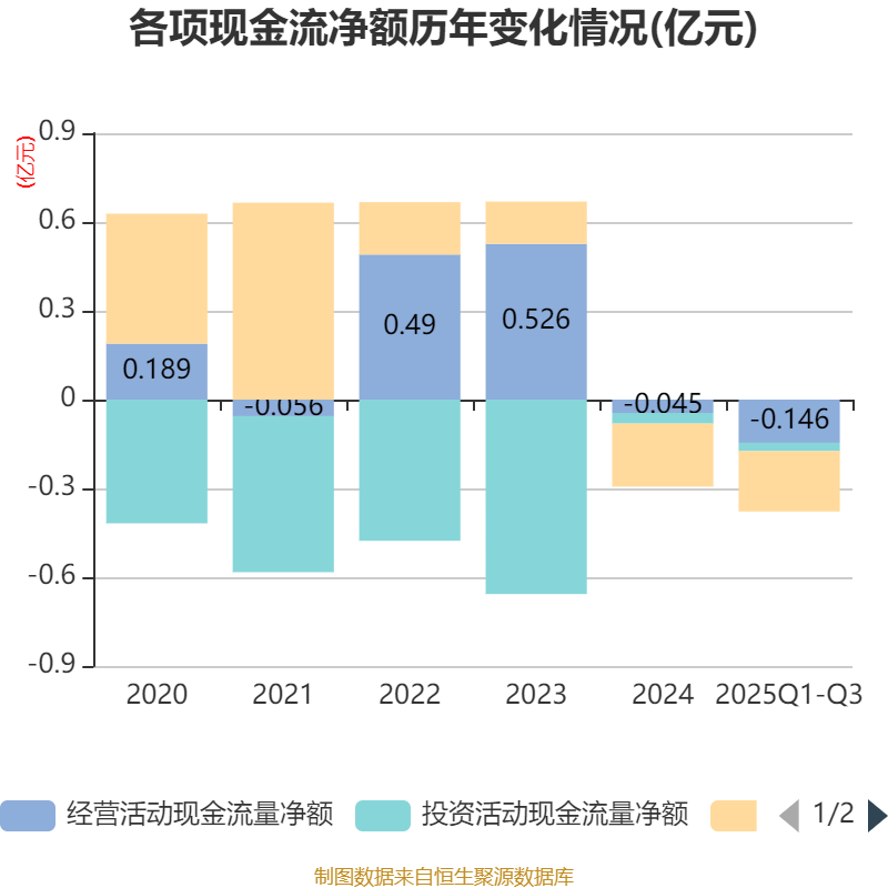2025年前三季度,公司经营活动现金流净额为-1463.43万元,同比增加817.18万元;筹资活动现金流净额-2043.38万元,同比增加1108.94万元;投资活动现金流净额-283.18万元,上年同期为-1278.09万元。
