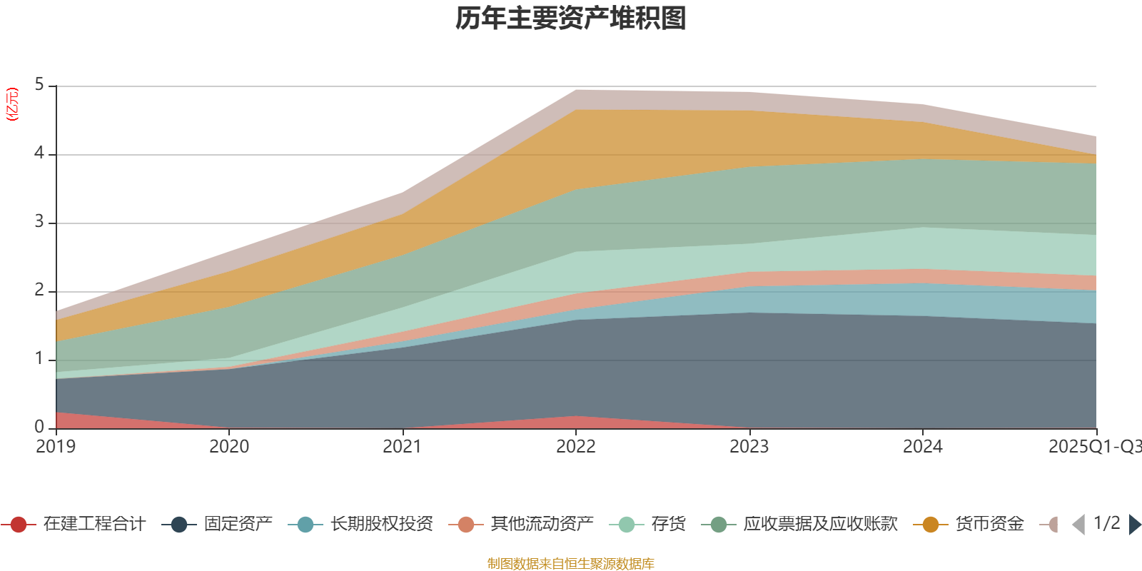 资产重大变化方面,截至2025年三季度末,公司货币资金较上年末减少76.29%,占公司总资产比重下降8.4个百分点;应收票据及应收账款较上年末增加4.61%,占公司总资产比重上升3.4个百分点;长期股权投资较上年末增加0.99%,占公司总资产比重上升1.22个百分点;固定资产较上年末减少6.92%,占公司总资产比重上升1.15个百分点。
