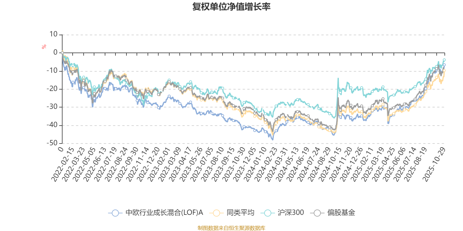 截至10月29日,中欧行业成长混合(LOF)A近三个月复权单位净值增长率为22.38%,位于同类可比基金43/185;近半年复权单位净值增长率为39.80%,位于同类可比基金52/185;近一年复权单位净值增长率为43.95%,位于同类可比基金45/181;近三年复权单位净值增长率为33.74%,位于同类可比基金59/175。
