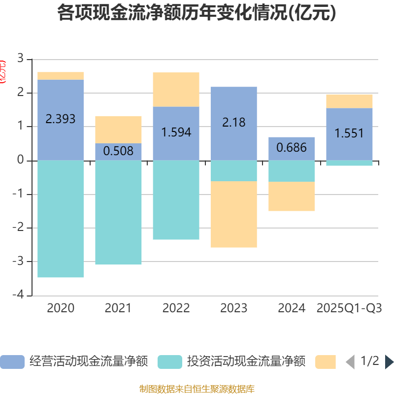 2025年前三季度,公司经营活动现金流净额为1.55亿元,同比增长54.5%;筹资活动现金流净额3997.47万元,同比增加2168.49万元;投资活动现金流净额-1564.05万元,上年同期为-3312.05万元。