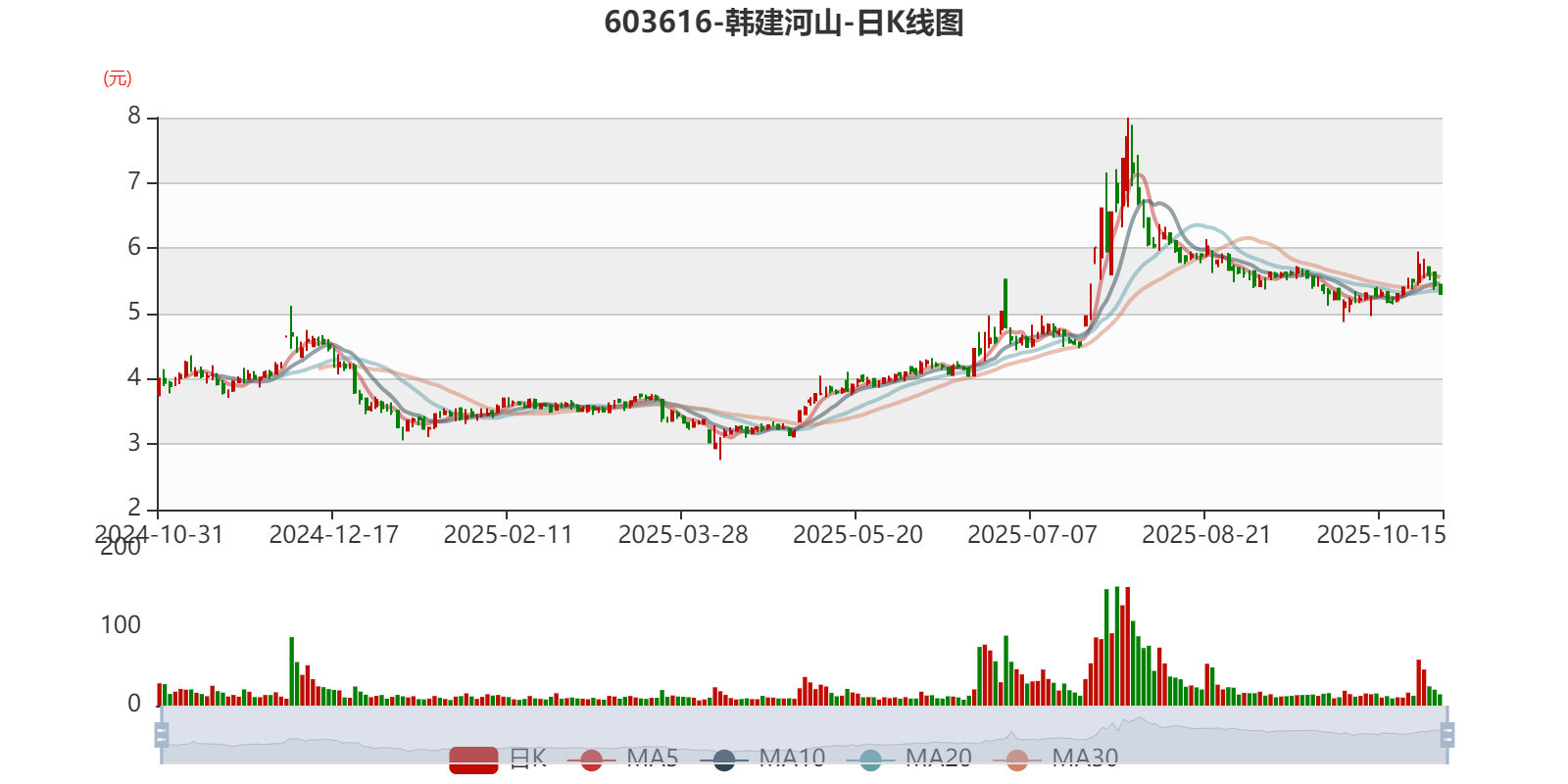 以10月30日收盘价计算,韩建河山目前市盈率(TTM)约为-11.51倍,市净率(LF)约8.26倍,市销率(TTM)约2.22倍。