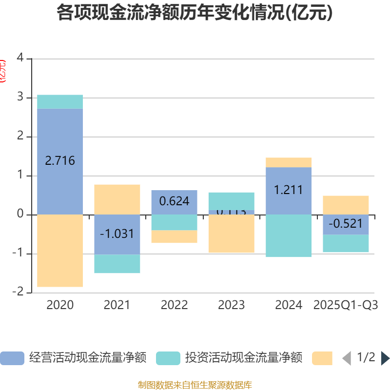 2025年前三季度,公司经营活动现金流净额为-5210.74万元,同比减少5263.61万元;筹资活动现金流净额4800.6万元,同比增加362.83万元;投资活动现金流净额-4435.69万元,上年同期为-6589.01万元。