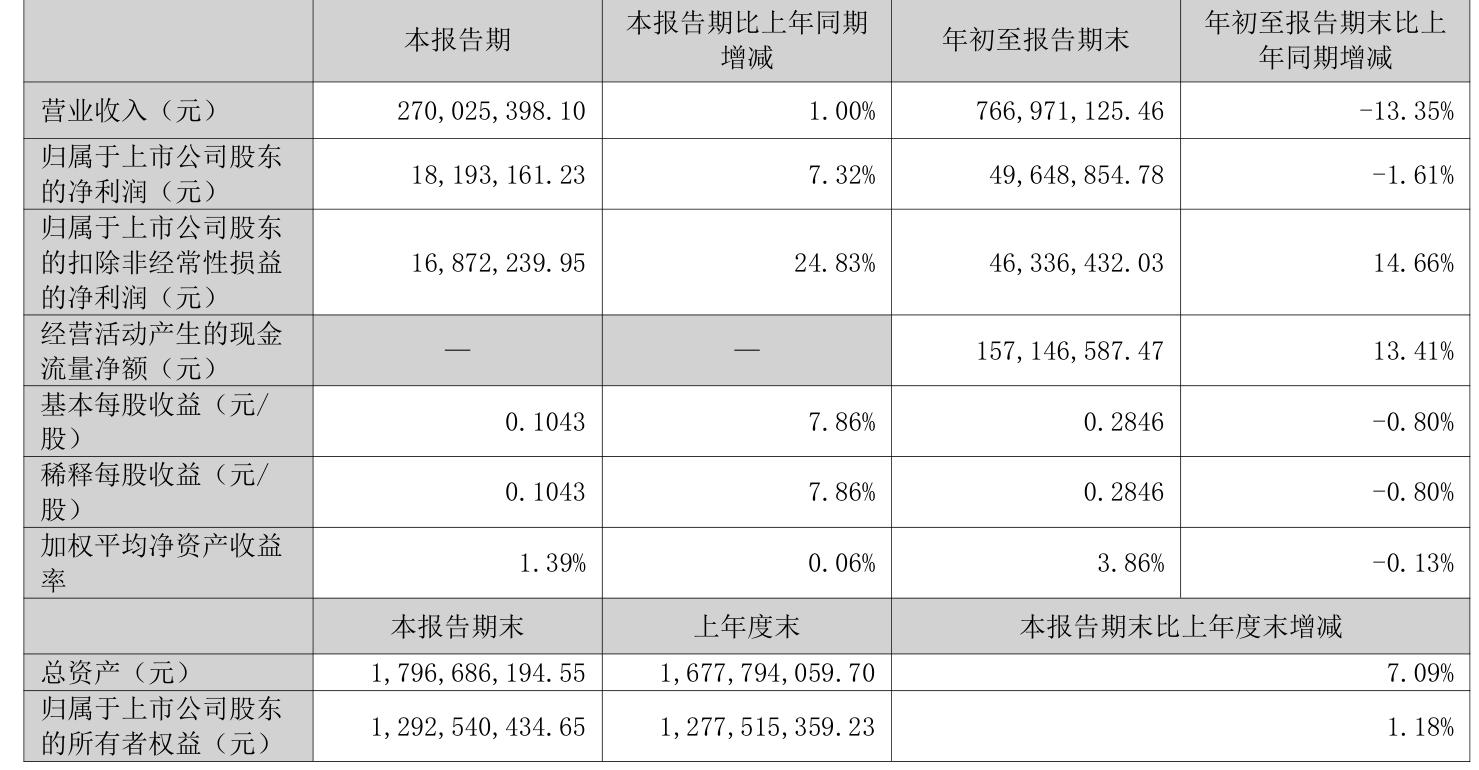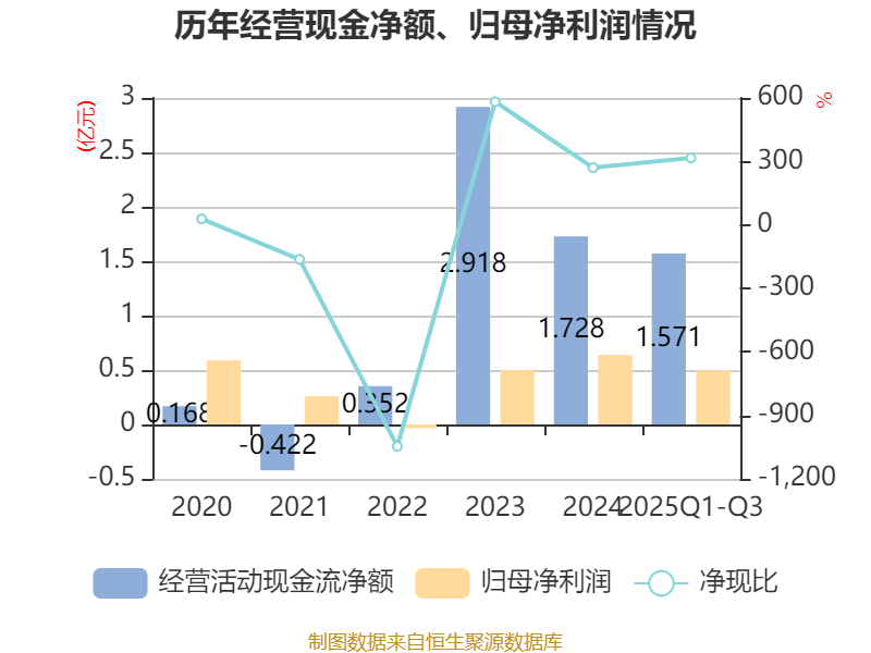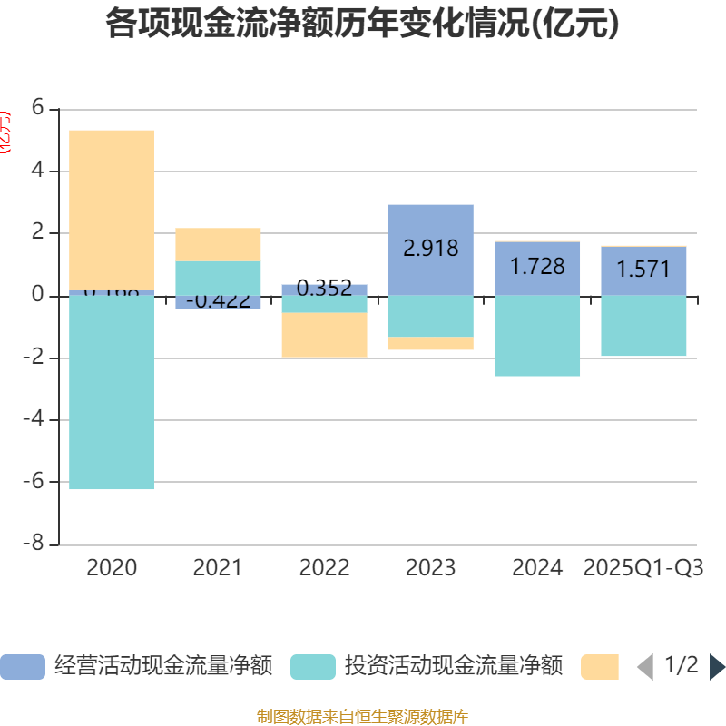 2025年前三季度,公司经营活动现金流净额为1.57亿元,同比增长13.41%;筹资活动现金流净额286.21万元,同比减少489.01万元;投资活动现金流净额-1.94亿元,上年同期为-3.13亿元。