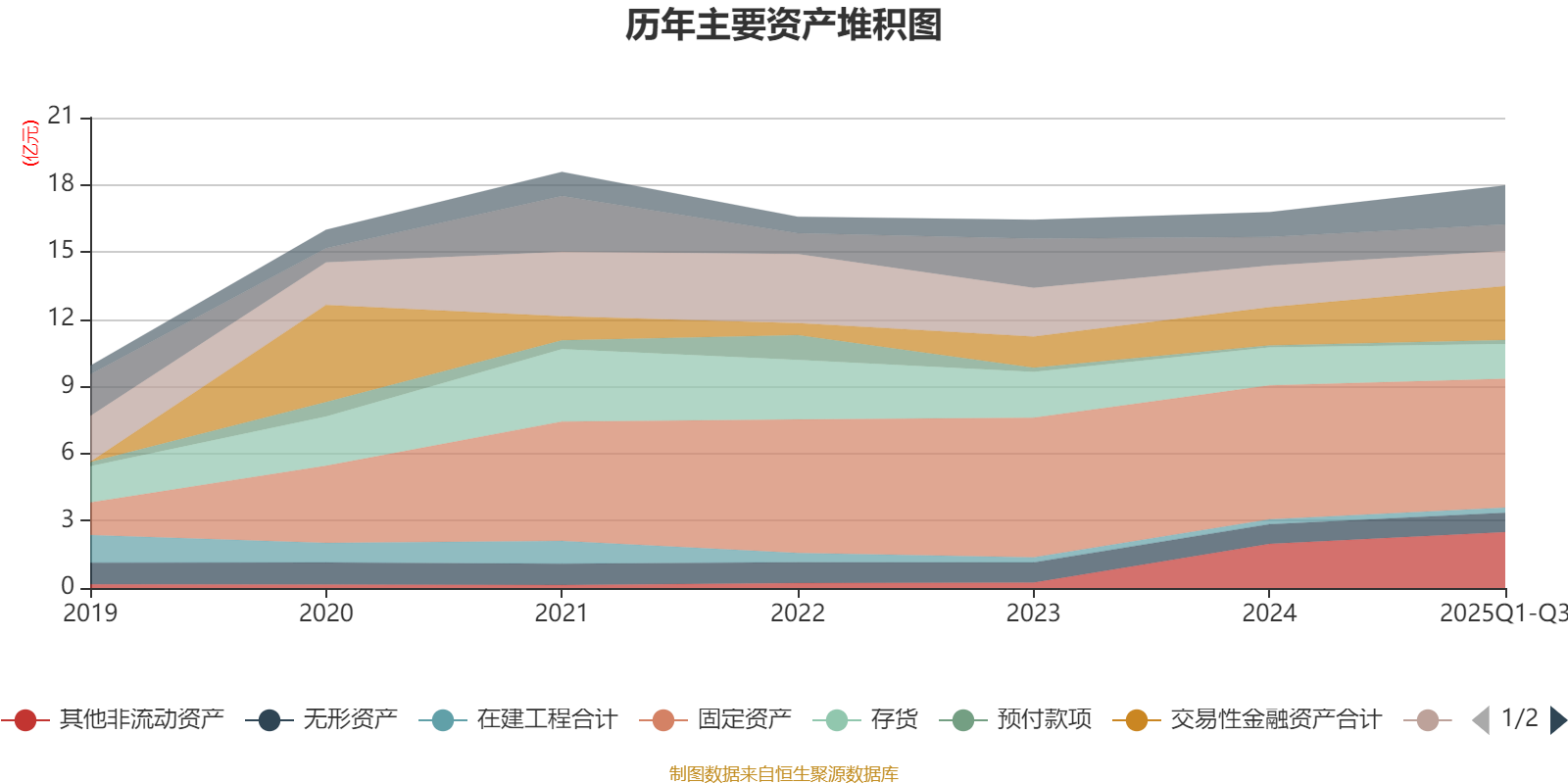 资产重大变化方面,截至2025年三季度末,公司固定资产较上年末减少3.85%,占公司总资产比重下降3.64个百分点;交易性金融资产合计较上年末增加41.62%,占公司总资产比重上升3.26个百分点;一年内到期的非流动资产较上年末增加226.49%,占公司总资产比重上升2.62个百分点;应收票据及应收账款较上年末减少15.57%,占公司总资产比重下降2.35个百分点。