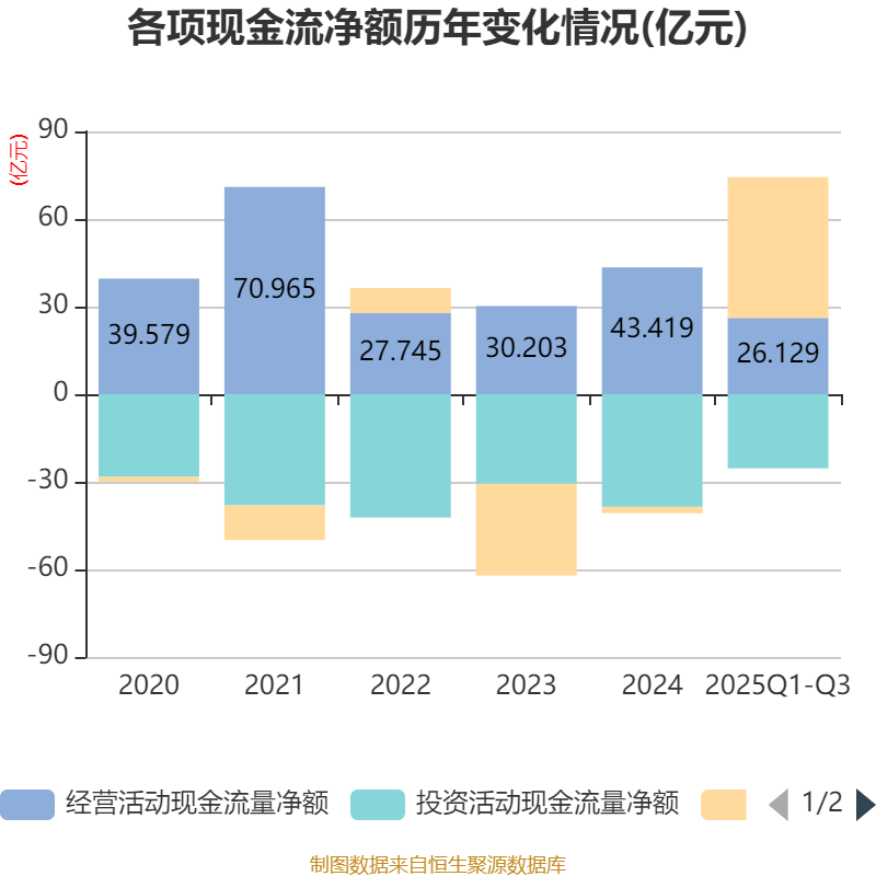 2025年前三季度,公司经营活动现金流净额为26.13亿元,同比下降20.25%;筹资活动现金流净额48.24亿元,同比增加37.57亿元;投资活动现金流净额-25.37亿元,上年同期为-30.6亿元。
