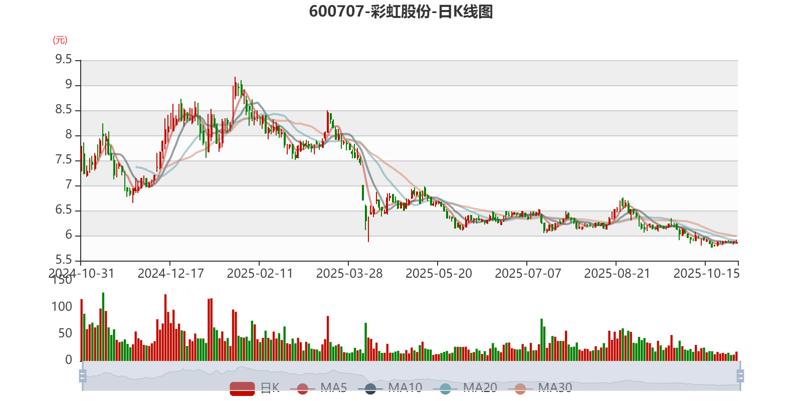 中证智能财讯彩虹股份(600707)10月31日披露2025年第三季度报告。前三季度公司实现营业总收入86.39亿元,同比下降4.04%;归母净利润3.79亿元,同比下降69.14%;扣非净利润3.21亿元,同比下降70.59%;经营活动产生的现金流量净额为26.13亿元,同比下降20.25%;报告期内,彩虹股份基本每股收益为0.106元,加权平均净资产收益率为1.75%。