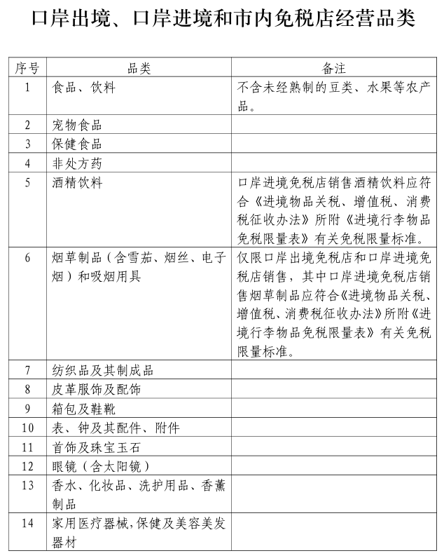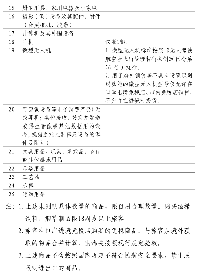 (一)进一步扩大口岸出境免税店、口岸进境免税店和市内免税店经营品类,新增手机、微型无人机、运动用品、保健食品、非处方药、宠物食品等商品。整合优化口岸出境免税店、口岸进境免税店和市内免税店经营品类清单。上述三类免税店具体经营品类见附件。