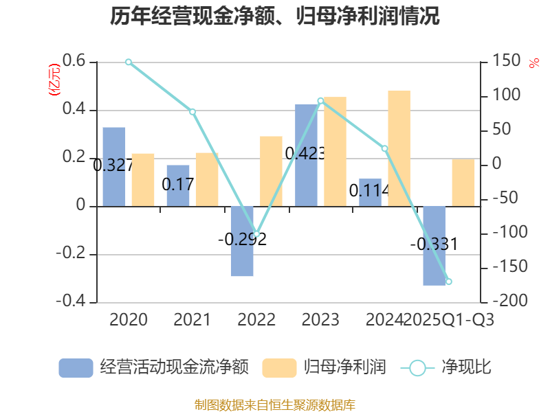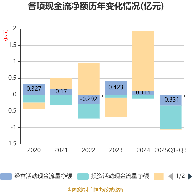 2025年前三季度,公司经营活动现金流净额为-3307.64万元,同比减少4435.85万元;筹资活动现金流净额-259.52万元,同比减少164.95万元;投资活动现金流净额-7034.15万元,上年同期为-958.13万元。
