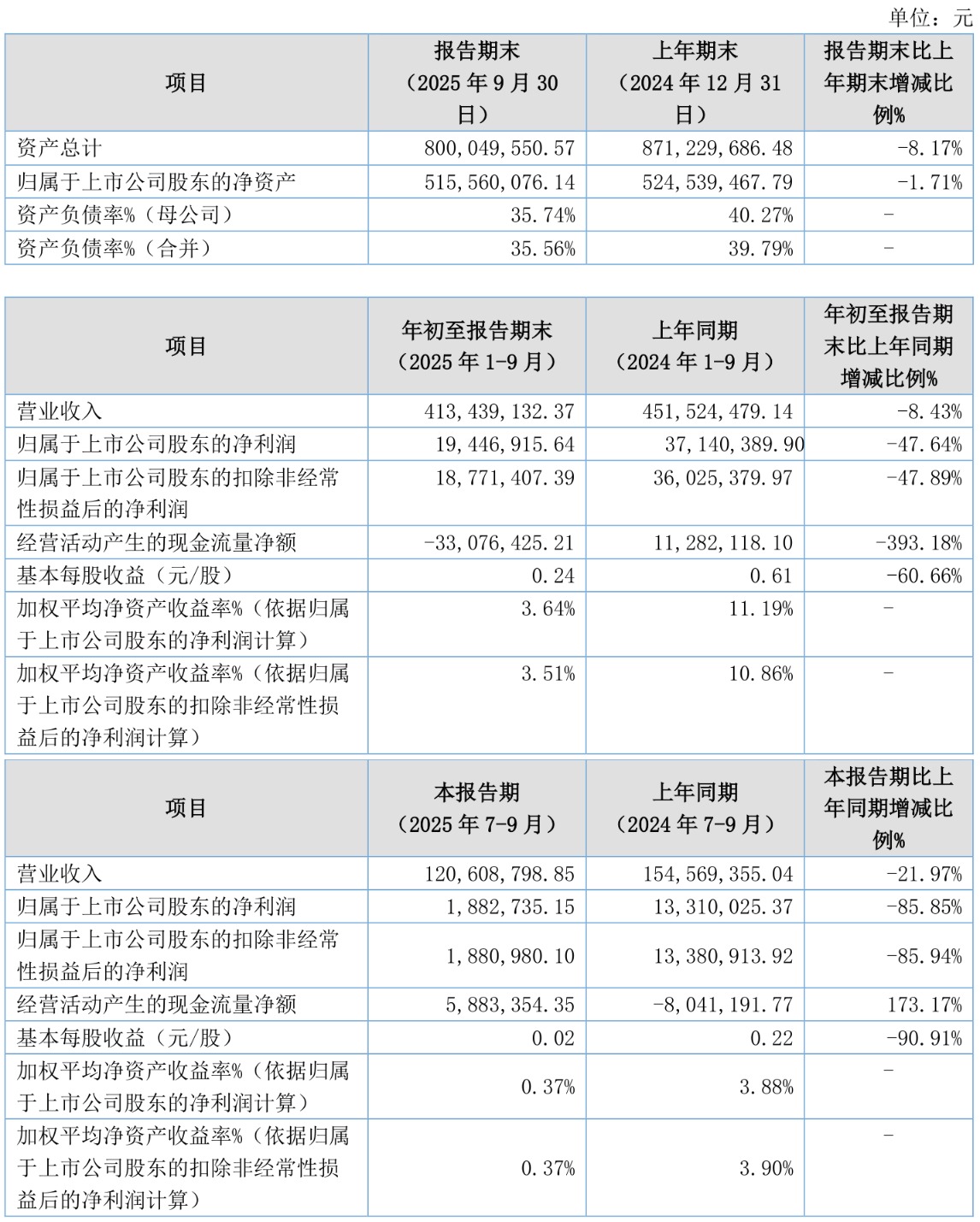 负债重大变化方面,截至2025年三季度末,公司应付票据及应付账款较上年末减少30.13%,占公司总资产比重下降5.58个百分点;短期借款较上年末增加21.66%,占公司总资产比重上升2.6个百分点;其他流动负债较上年末减少26.85%,占公司总资产比重下降1.21个百分点;其他应付款(含利息和股利)较上年末减少44.55%,占公司总资产比重下降0.29个百分点。