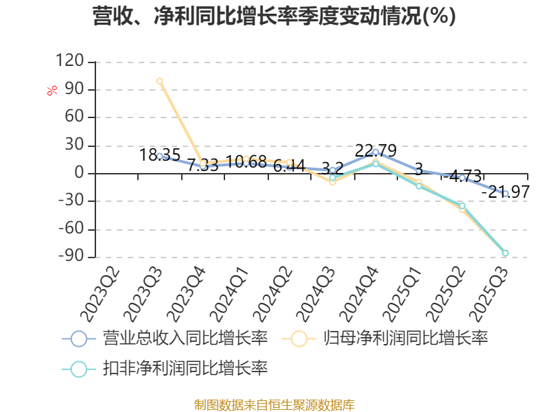资产重大变化方面,截至2025年三季度末,公司货币资金较上年末减少47.38%,占公司总资产比重下降11.78个百分点;交易性金融资产合计占公司总资产的7.82%,上年末为0;固定资产较上年末增加8.52%,占公司总资产比重上升3.44个百分点;应收票据及应收账款较上年末减少17.43%,占公司总资产比重下降3.35个百分点。