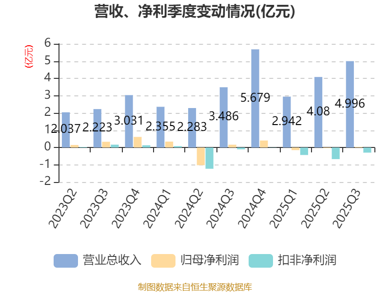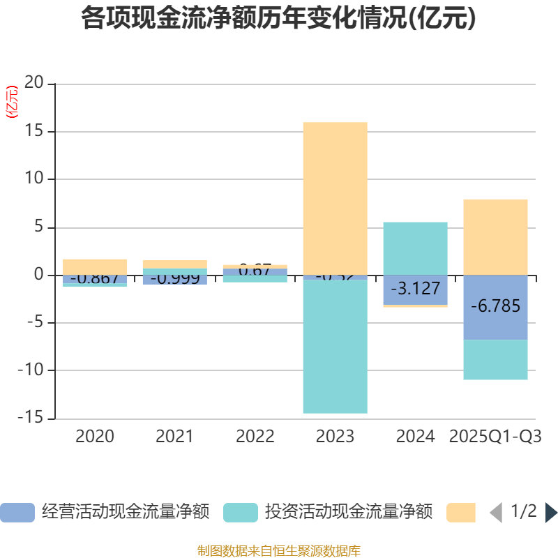 2025年前三季度,公司经营活动现金流净额为-6.79亿元,同比减少4.81亿元;筹资活动现金流净额7.9亿元,同比增加8.97亿元;投资活动现金流净额-4.16亿元,上年同期为3.8亿元。