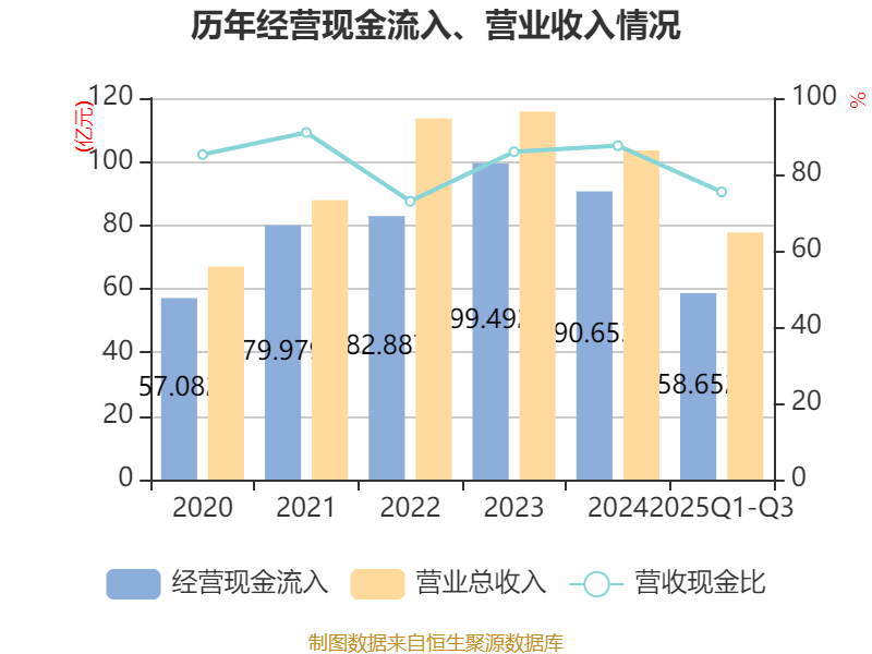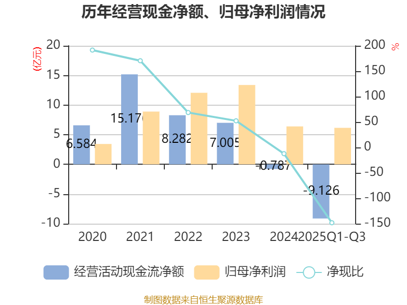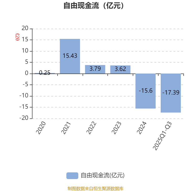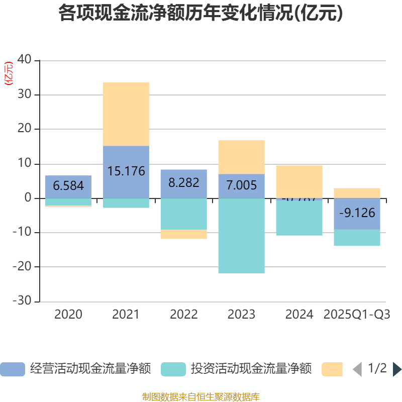 2025年前三季度,公司经营活动现金流净额为-9.13亿元,同比减少3.09亿元;筹资活动现金流净额2.86亿元,同比增加3542.61万元;投资活动现金流净额-4.68亿元,上年同期为-10.3亿元。