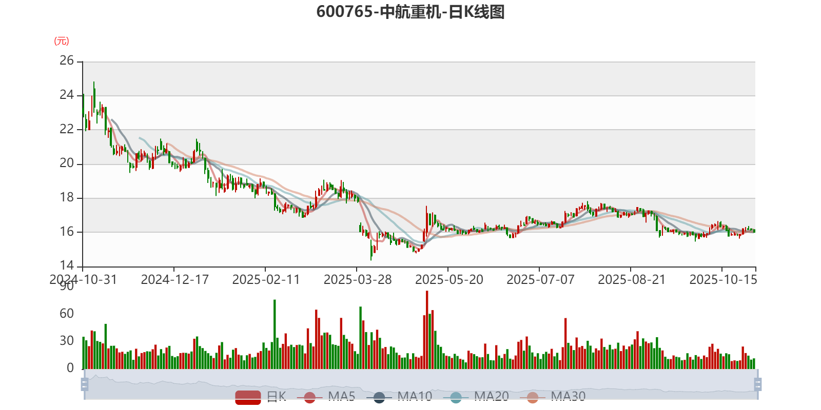 中证智能财讯中航重机(600765)10月31日披露2025年第三季度报告。前三季度公司实现营业总收入77.76亿元,同比下降6.59%;归母净利润6.16亿元,同比下降39.72%;扣非净利润5.34亿元,同比下降44.50%;经营活动产生的现金流量净额为-9.13亿元,上年同期为-6.04亿元;报告期内,中航重机基本每股收益为0.39元,加权平均净资产收益率为4.31%。
