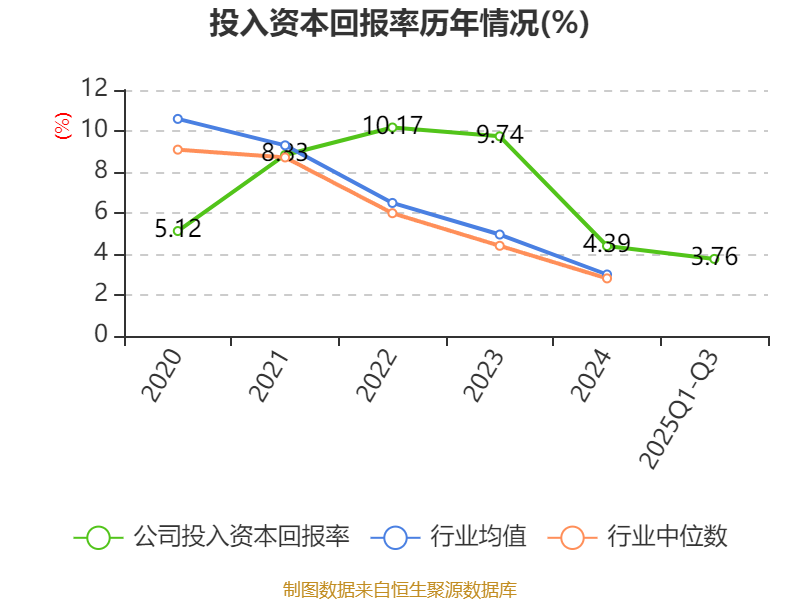 盈利能力方面, 2025年前三季度公司加权平均净资产收益率为4.31%,同比下降4.17个百分点。公司2025年前三季度投入资本回报率为3.76%,较上年同期下降2.63个百分点。