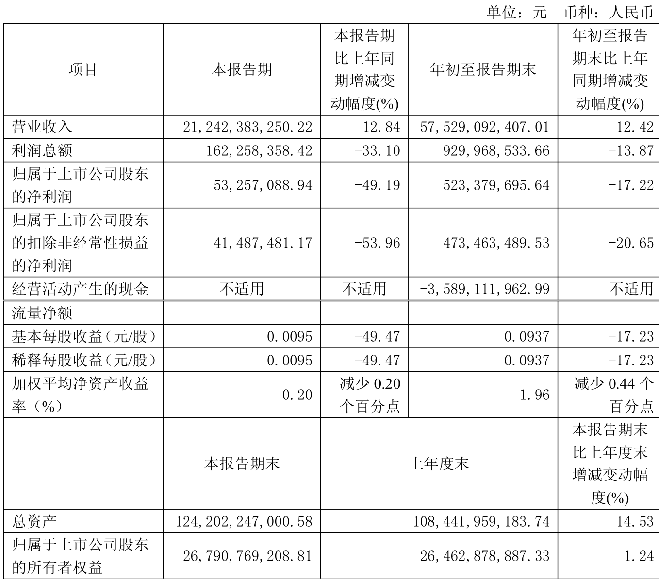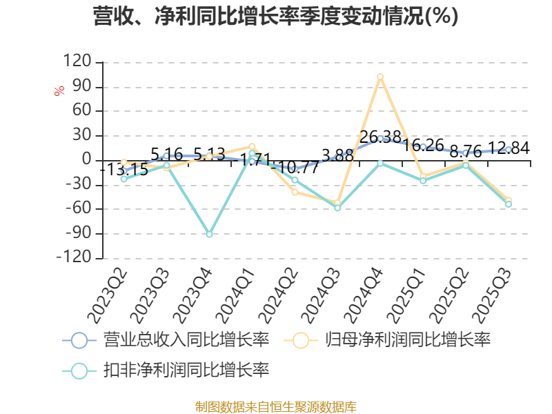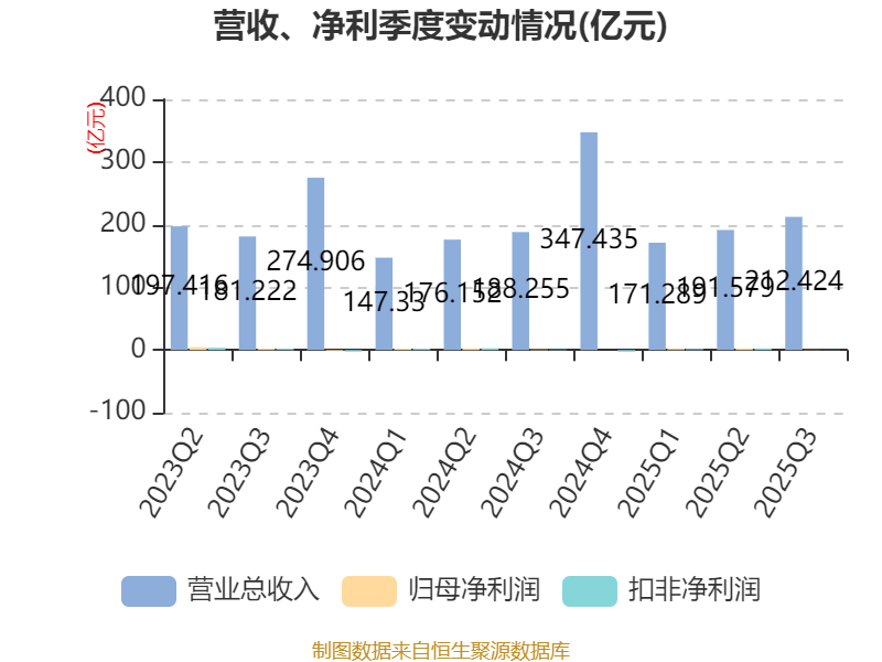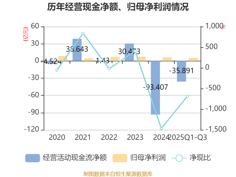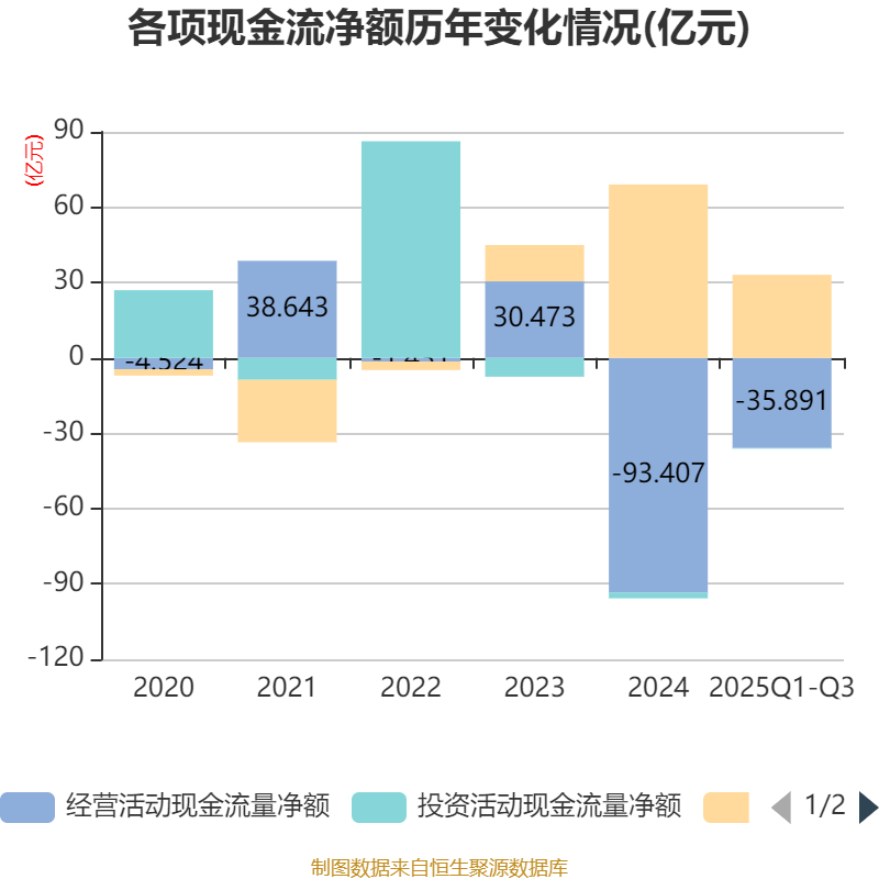 2025年前三季度,公司经营活动现金流净额为-35.89亿元,同比增加37.27亿元;筹资活动现金流净额33.08亿元,同比增加17.42亿元;投资活动现金流净额-2619.6万元,上年同期为-1.39亿元。