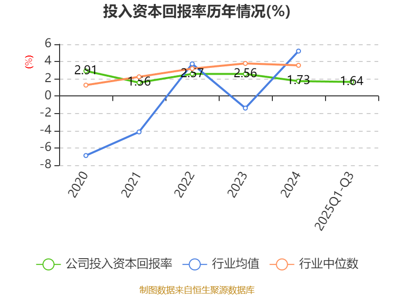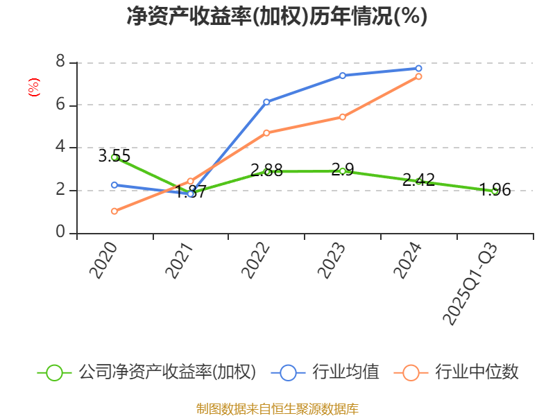 盈利能力方面, 2025年前三季度公司加权平均净资产收益率为1.96%,同比下降0.44个百分点。公司2025年前三季度投入资本回报率为1.64%,较上年同期下降0.24个百分点。