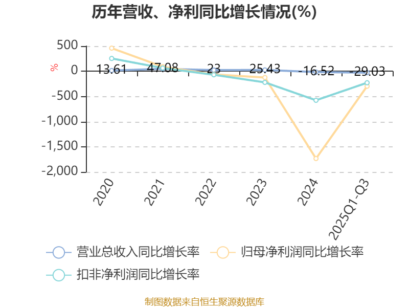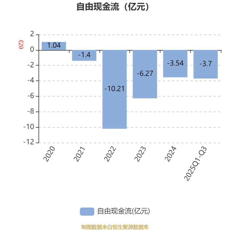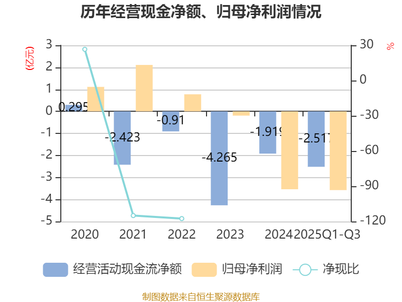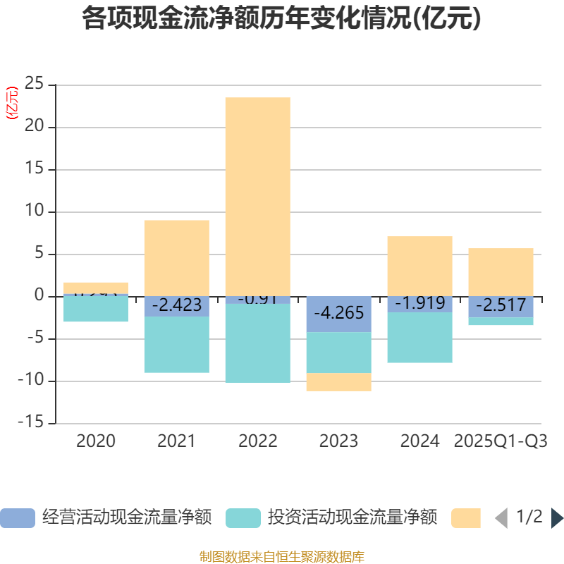 2025年前三季度,公司经营活动现金流净额为-2.52亿元,同比增加1.18亿元;筹资活动现金流净额5.66亿元,同比增加2249.38万元;投资活动现金流净额-9100.4万元,上年同期为-2.31亿元。