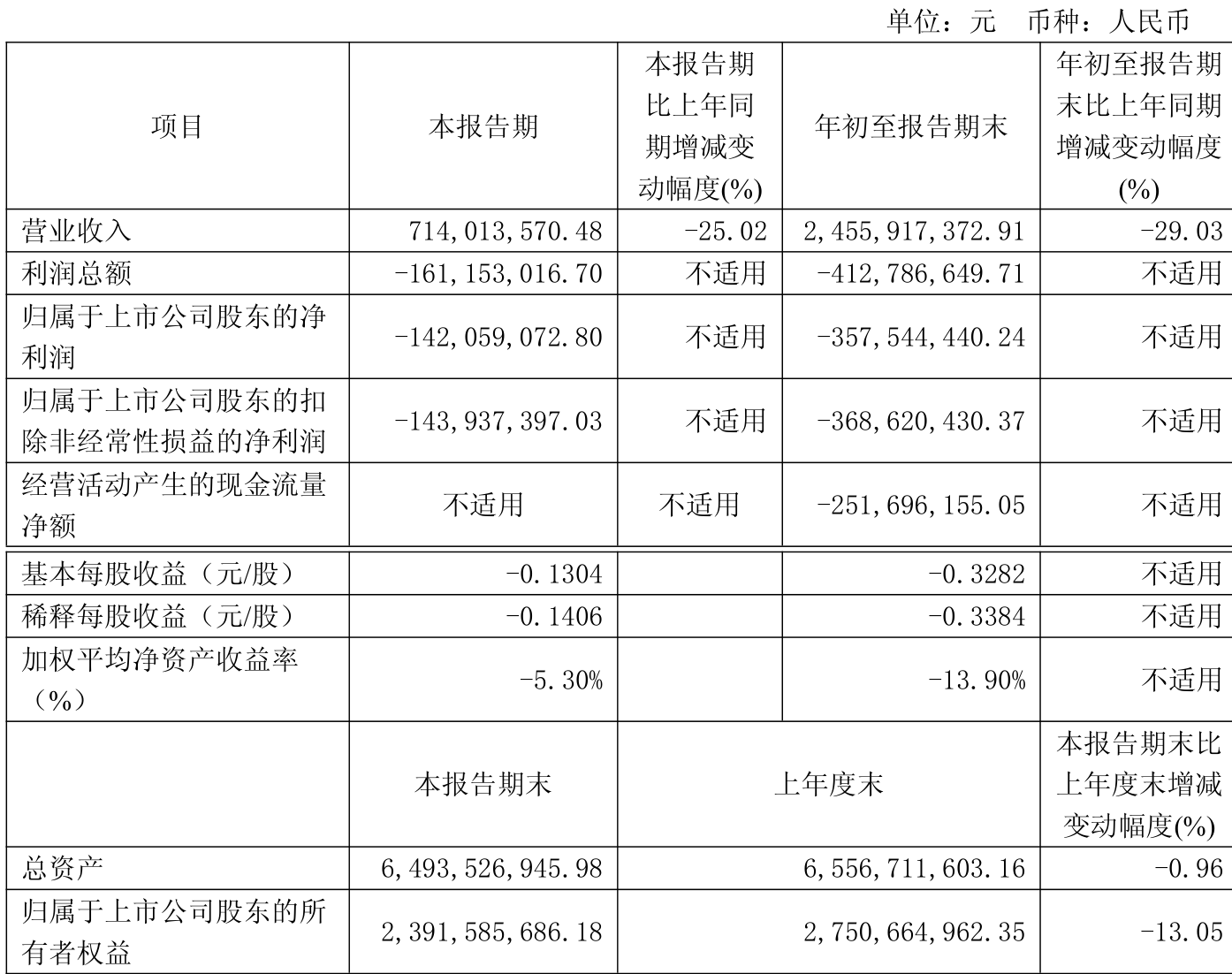 中证智能财讯安彩高科(600207)10月31日披露2025年第三季度报告。前三季度公司实现营业总收入24.56亿元,同比下降29.03%;归母净利润亏损3.58亿元,上年同期亏损8991.51万元;扣非净利润亏损3.69亿元,上年同期亏损1.12亿元;经营活动产生的现金流量净额为-2.52亿元,上年同期为-3.7亿元;报告期内,安彩高科基本每股收益为-0.3282元,加权平均净资产收益率为-13.90%。