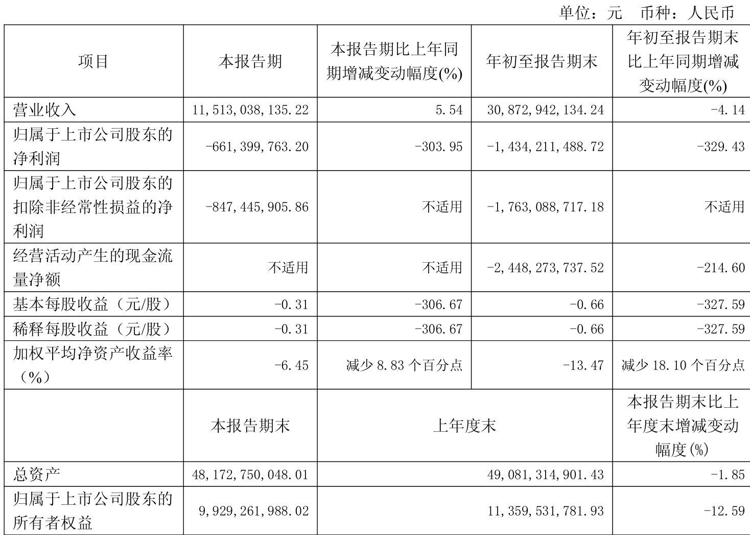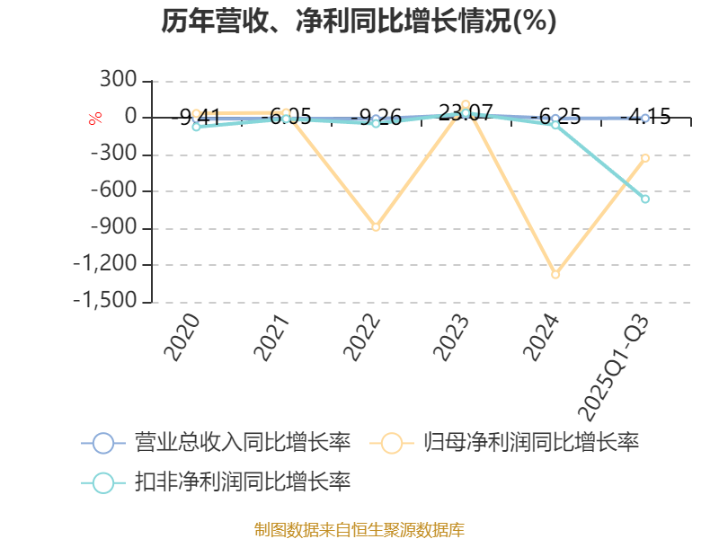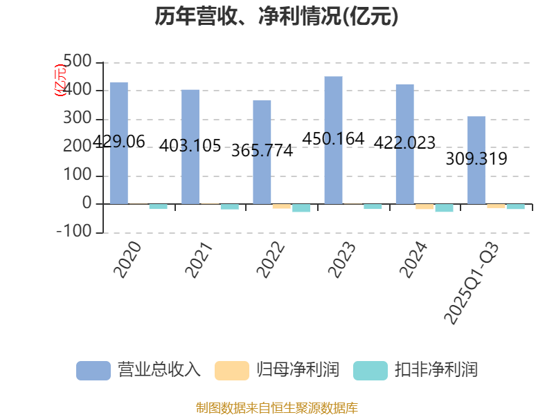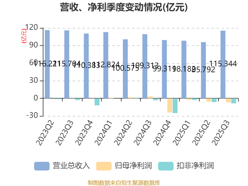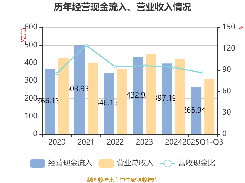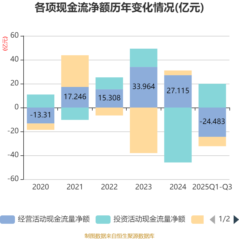 2025年前三季度,公司经营活动现金流净额为-24.48亿元,同比减少45.85亿元;筹资活动现金流净额-7.86亿元,同比减少7.39亿元;投资活动现金流净额19.89亿元,上年同期为-28.31亿元。