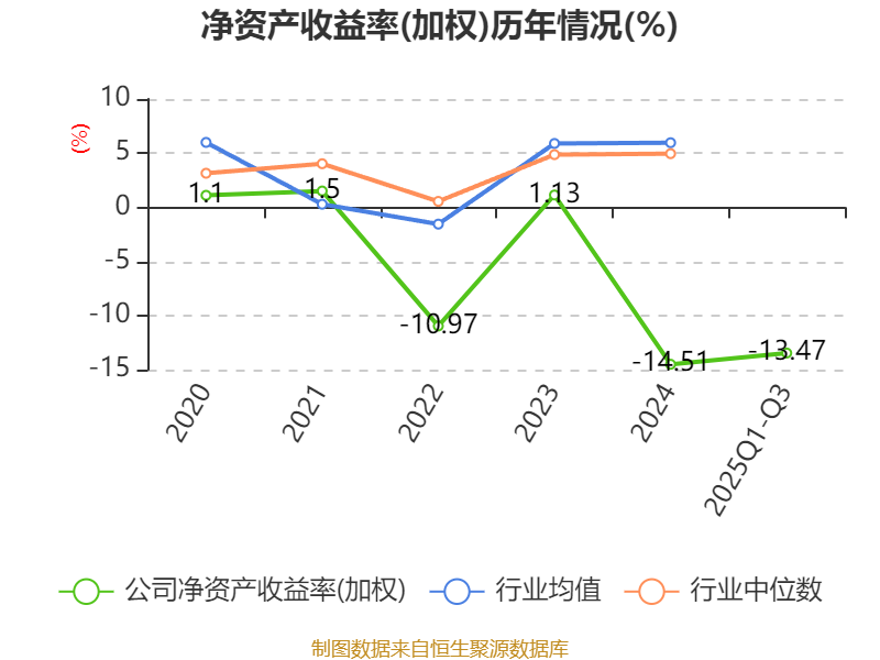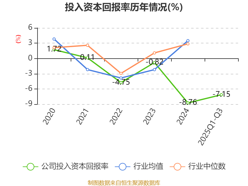 盈利能力方面, 2025年前三季度公司加权平均净资产收益率为-13.47%,同比下降18.1个百分点。公司2025年前三季度投入资本回报率为-7.15%,较上年同期下降9.26个百分点。