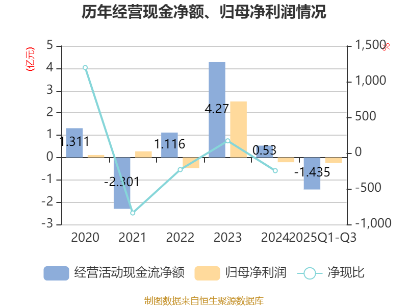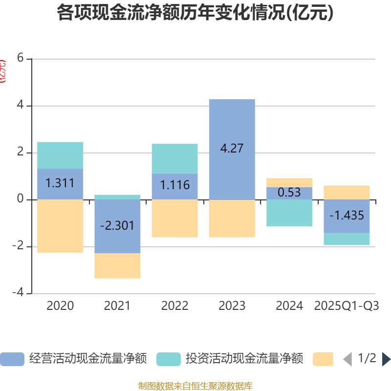 2025年前三季度,公司经营活动现金流净额为-1.44亿元,同比增加8343.32万元;筹资活动现金流净额5890.73万元,同比减少1739.7万元;投资活动现金流净额-5105.69万元,上年同期为-8764.16万元。