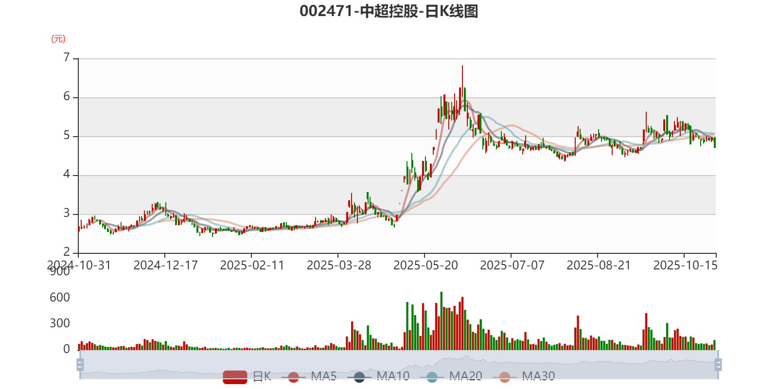 中证智能财讯中超控股(002471)10月31日披露2025年第三季度报告。前三季度公司实现营业总收入38.46亿元,同比下降2.21%;归母净利润亏损2498.23万元,上年同期亏损681.83万元;扣非净利润亏损2664.46万元,上年同期亏损3011.39万元;经营活动产生的现金流量净额为-1.44亿元,上年同期为-2.27亿元;报告期内,中超控股基本每股收益为-0.0191元,加权平均净资产收益率为-1.44%。