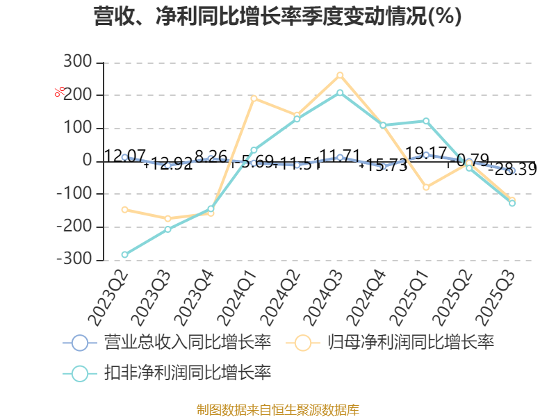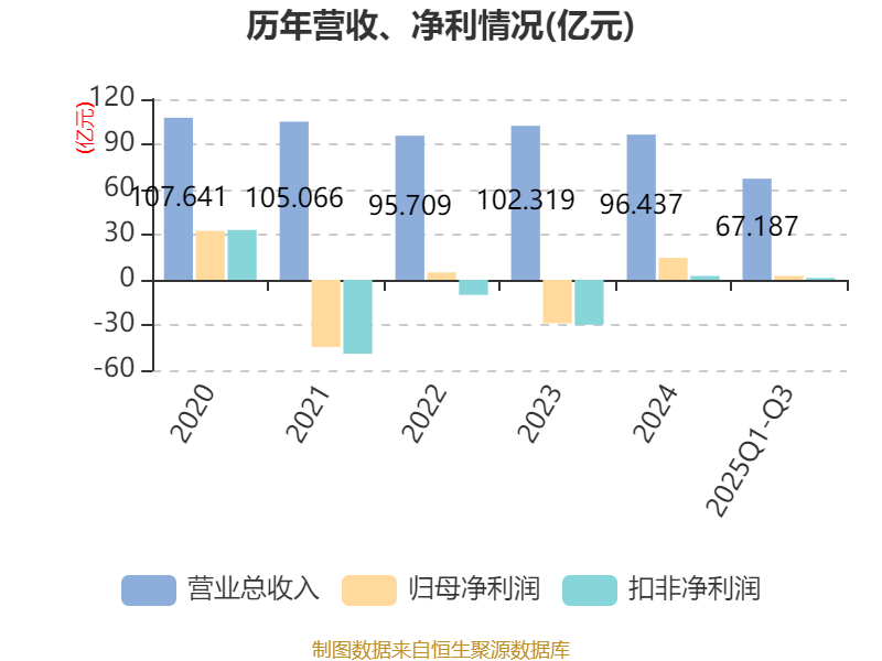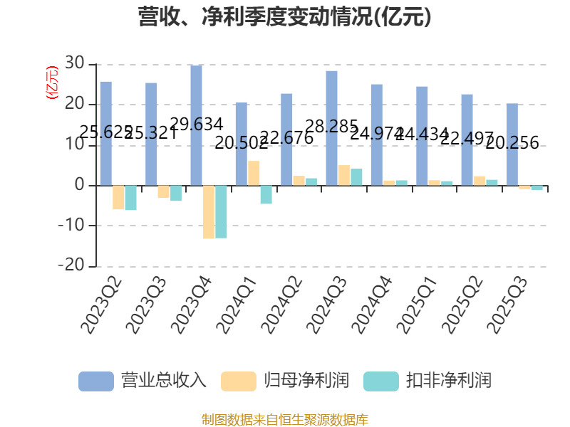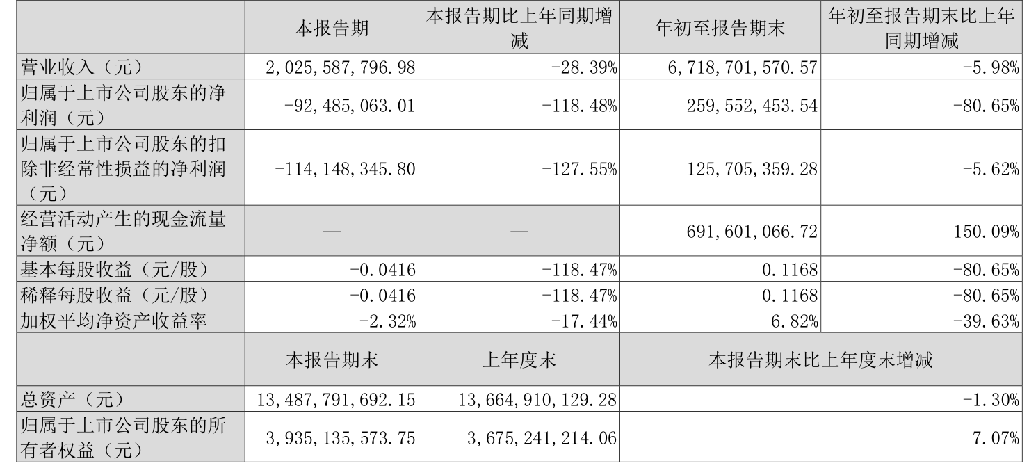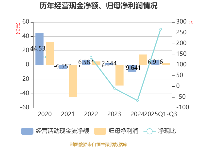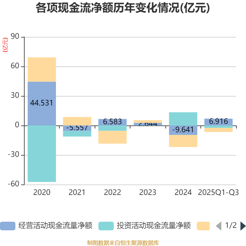 2025年前三季度,公司经营活动现金流净额为6.92亿元,同比增加20.72亿元;筹资活动现金流净额-4.17亿元,同比增加5.37亿元;投资活动现金流净额-2.45亿元,上年同期为14.48亿元。