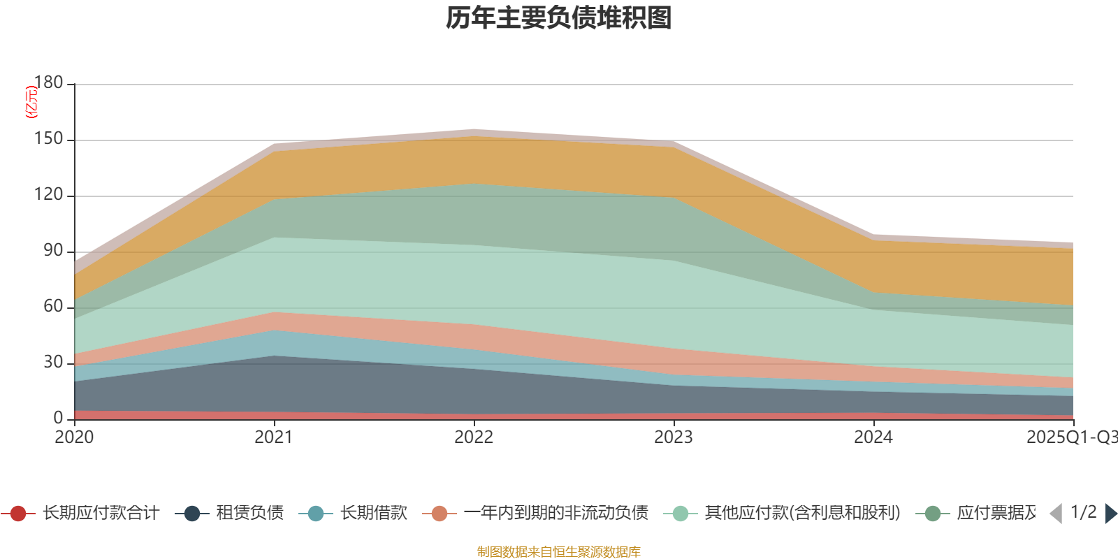 负债重大变化方面,截至2025年三季度末,公司短期借款较上年末增加9.56%,占公司总资产比重上升2.24个百分点;一年内到期的非流动负债较上年末减少31.68%,占公司总资产比重下降1.87个百分点;其他应付款(含利息和股利)较上年末减少7.17%,占公司总资产比重下降1.32个百分点;长期应付款合计较上年末减少41.02%,占公司总资产比重下降1.02个百分点。