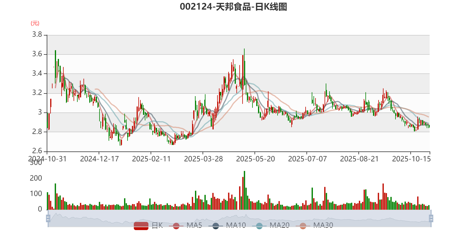 中证智能财讯天邦食品(002124)10月31日披露2025年第三季度报告。前三季度公司实现营业总收入67.19亿元,同比下降5.98%;归母净利润2.6亿元,同比下降80.65%;扣非净利润1.26亿元,同比下降5.62%;经营活动产生的现金流量净额为6.92亿元,上年同期为-13.81亿元;报告期内,天邦食品基本每股收益为0.1168元,加权平均净资产收益率为6.82%。