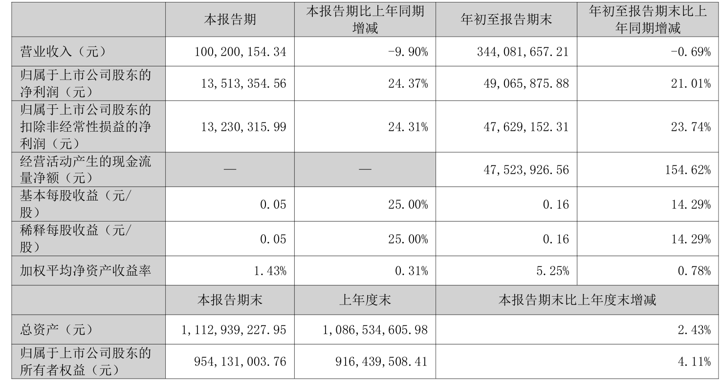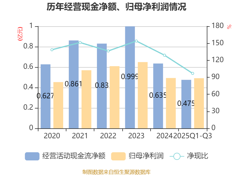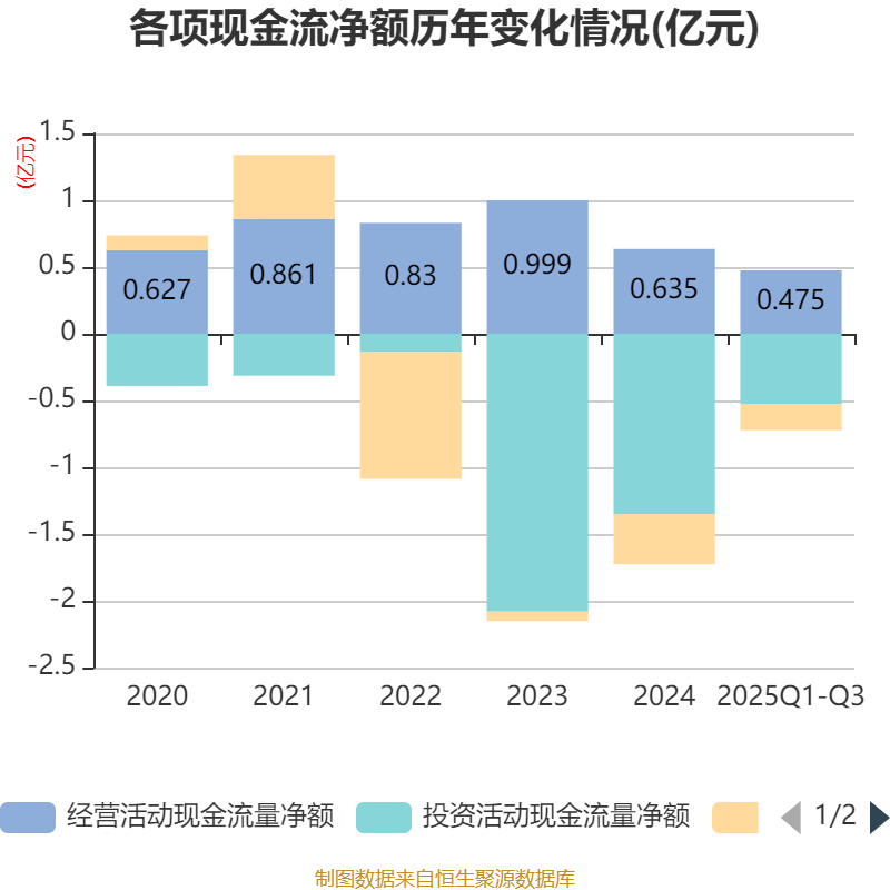 2025年前三季度,公司经营活动现金流净额为4752.39万元,同比增长154.62%;筹资活动现金流净额-1976.22万元,同比增加1737.8万元;投资活动现金流净额-5253.36万元,上年同期为-1.04亿元。