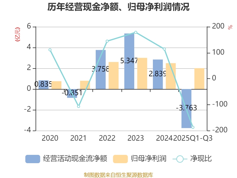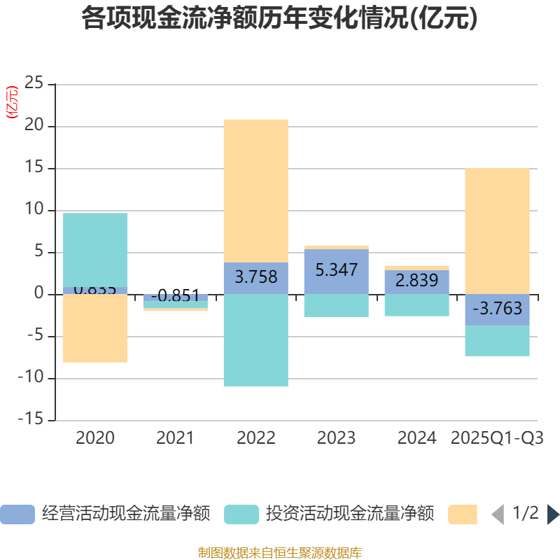 2025年前三季度,公司经营活动现金流净额为-3.76亿元,同比减少9150.63万元;筹资活动现金流净额14.98亿元,同比增加18.03亿元;投资活动现金流净额-3.64亿元,上年同期为-1.56亿元。