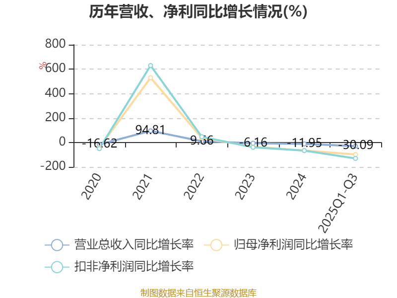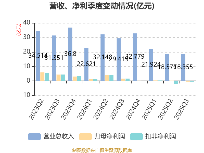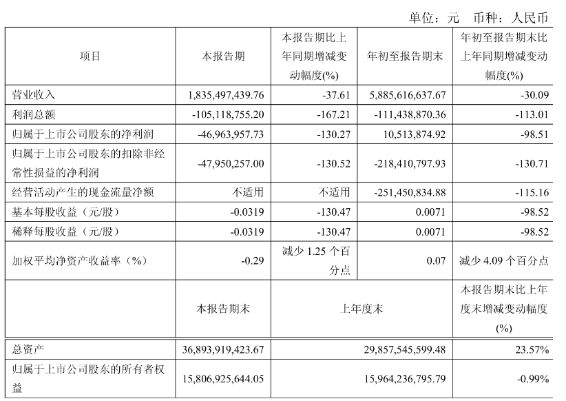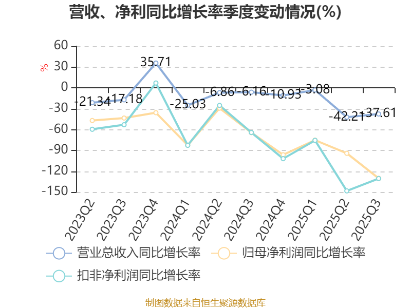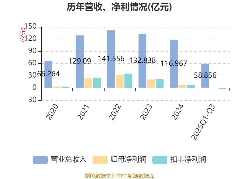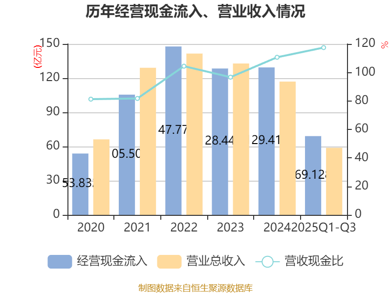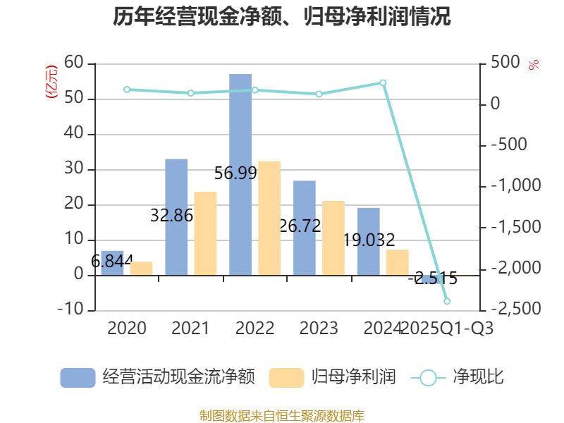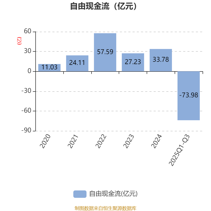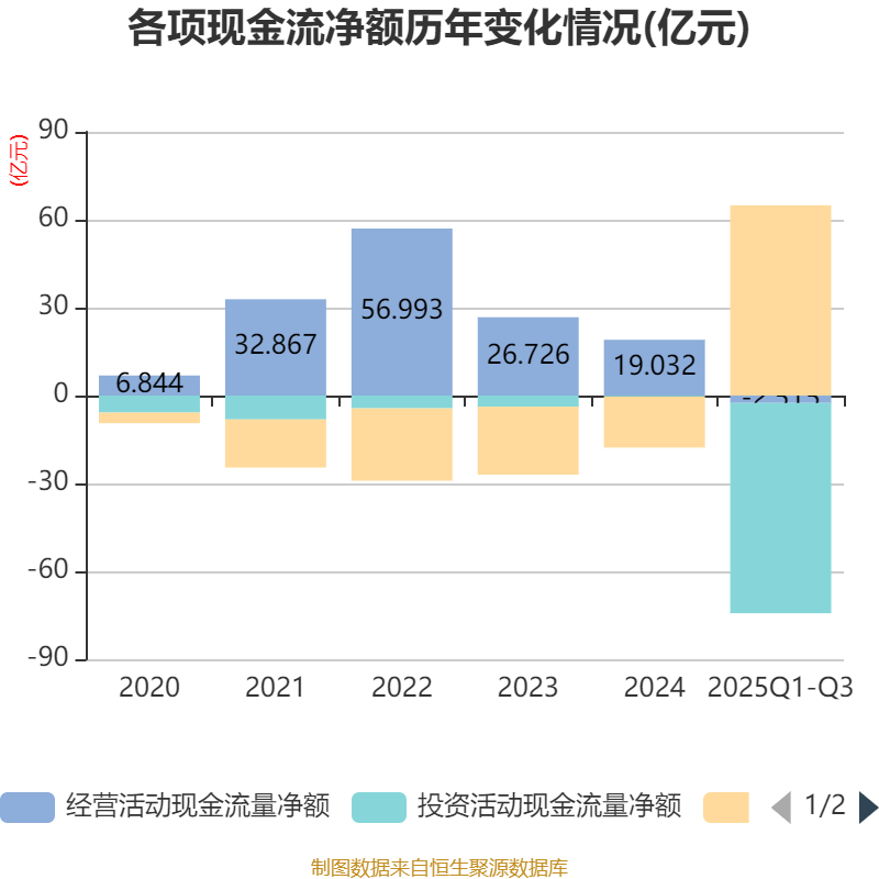 2025年前三季度,公司经营活动现金流净额为-2.51亿元,同比减少19.1亿元;筹资活动现金流净额64.93亿元,同比增加72.08亿元;投资活动现金流净额-71.79亿元,上年同期为1.72亿元。