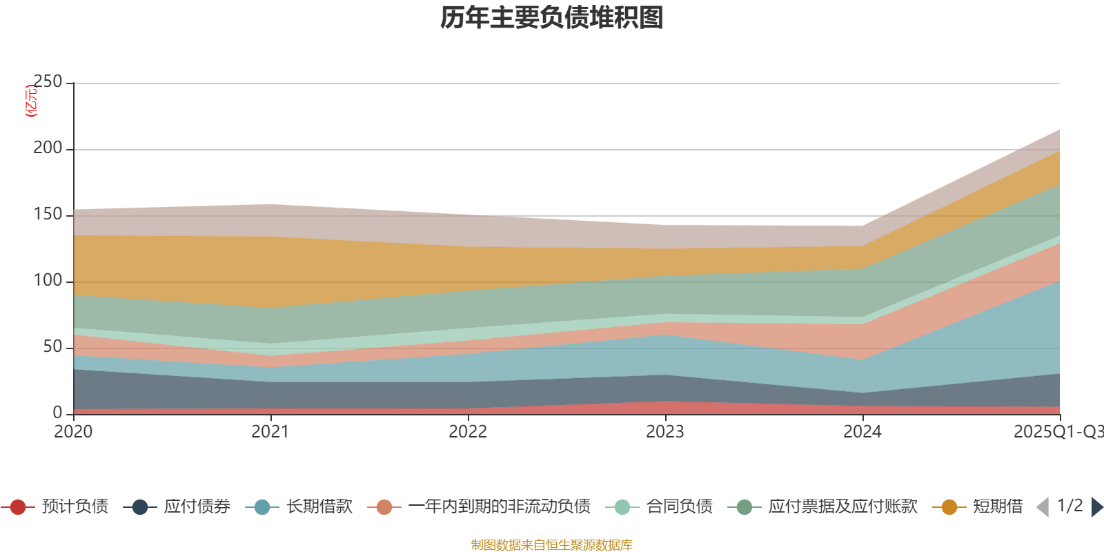 负债重大变化方面,截至2025年三季度末,公司长期借款较上年末增加180.94%,占公司总资产比重上升10.64个百分点;应付债券较上年末增加150.05%,占公司总资产比重上升3.42个百分点;应付票据及应付账款较上年末增加5.76%,占公司总资产比重下降1.76个百分点;一年内到期的非流动负债较上年末增加5.74%,占公司总资产比重下降1.29个百分点。