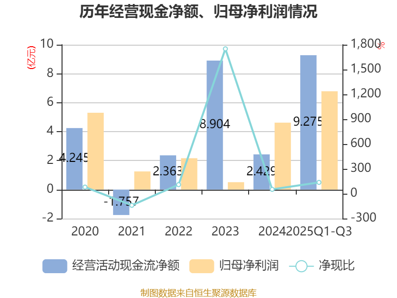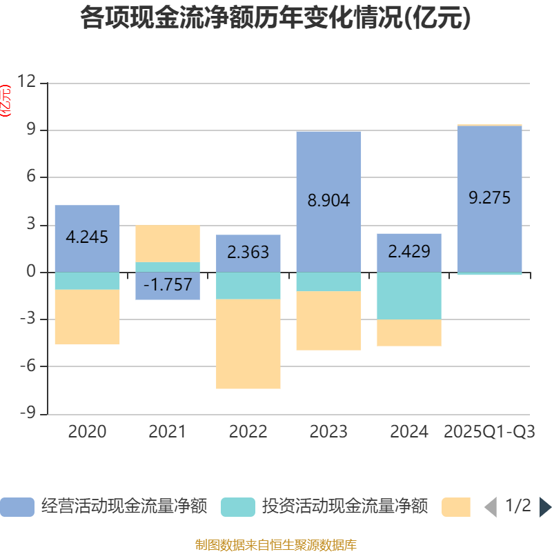 2025年前三季度,公司经营活动现金流净额为9.27亿元,同比下降18.44%;筹资活动现金流净额893.53万元,同比增加5.62亿元;投资活动现金流净额-1700.21万元,上年同期为-2.8亿元。