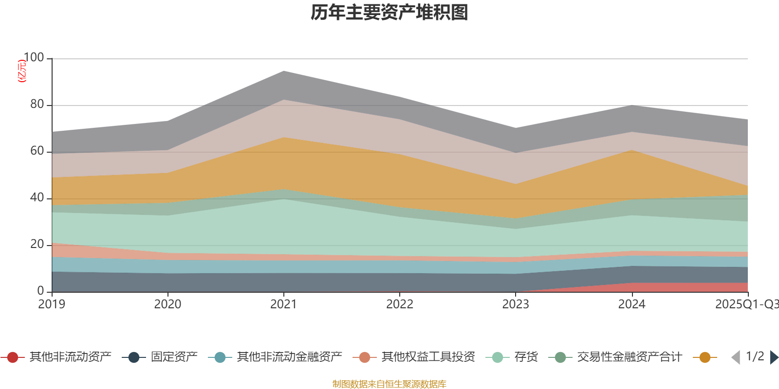资产重大变化方面,截至2025年三季度末,公司应收票据及应收账款较上年末减少81.75%,占公司总资产比重下降21.31个百分点;货币资金较上年末增加121.22%,占公司总资产比重上升13.44个百分点;交易性金融资产合计较上年末增加69.28%,占公司总资产比重上升7.05个百分点;存货较上年末减少15.26%,占公司总资产比重下降1.58个百分点。