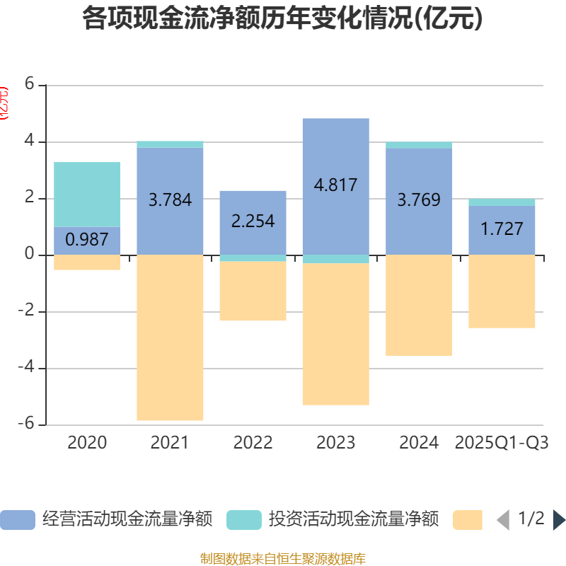 2025年前三季度,公司经营活动现金流净额为1.73亿元,同比下降2.2%;筹资活动现金流净额-2.59亿元,同比减少1.16亿元;投资活动现金流净额2467万元,上年同期为-508.42万元。