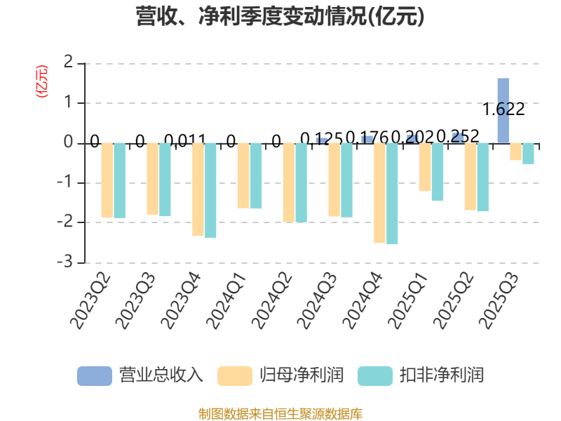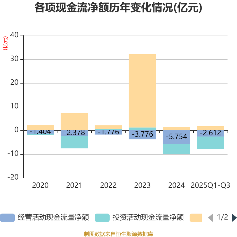 2025年前三季度,公司经营活动现金流净额为-2.61亿元,同比增加1.61亿元;筹资活动现金流净额1.76亿元,同比增加7832.42万元;投资活动现金流净额-5.36亿元,上年同期为-4.18亿元。