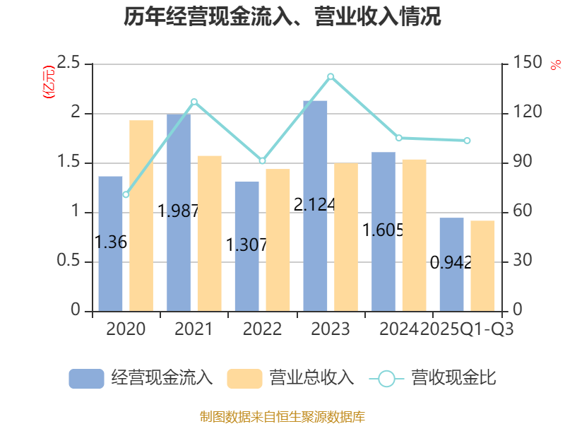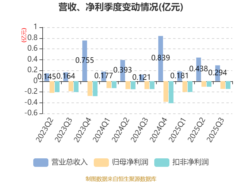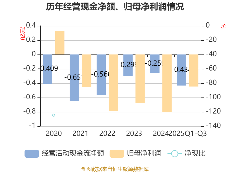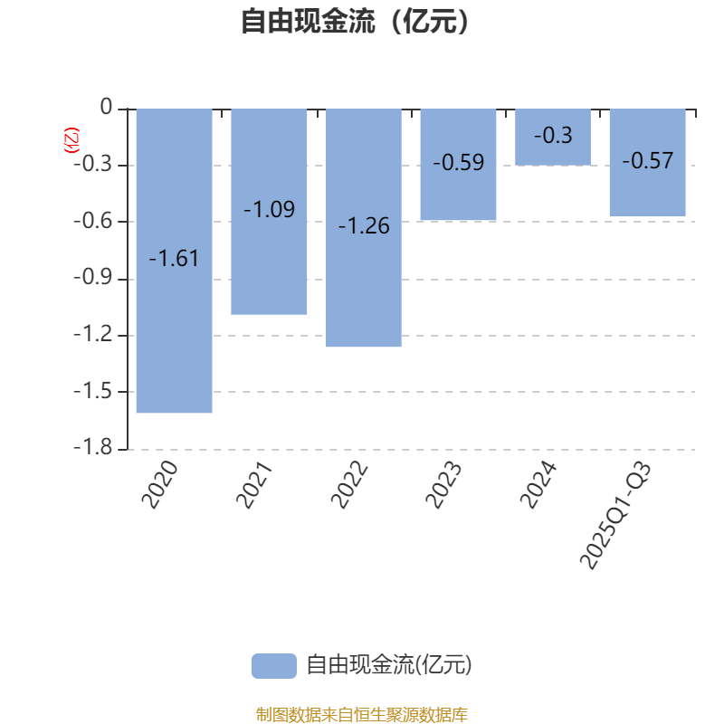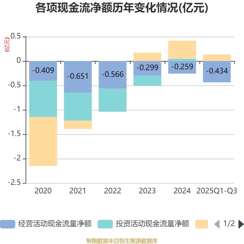 2025年前三季度,公司经营活动现金流净额为-4338.04万元,同比减少1109.54万元;筹资活动现金流净额1317.42万元,同比减少449.83万元;投资活动现金流净额-62.76万元,上年同期为-2559.73万元。