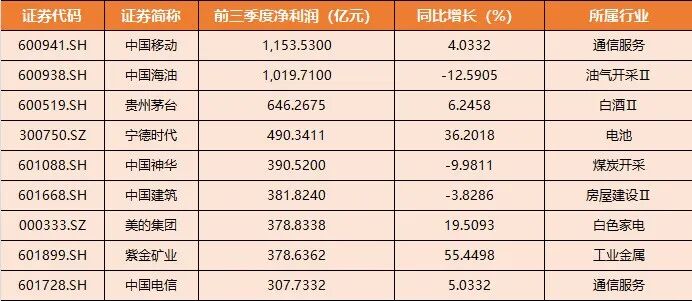 从净利润金额来看,上述5385家上市公司中,2210家公司净利润超1亿元,832家公司超5亿元,483家公司超10亿元。剔除金融股影响,中国移动、中国海油、贵州茅台、宁德时代、中国神华、中国建筑、美的集团、紫金矿业、中国电信等公司前三季度净利润超300亿元。