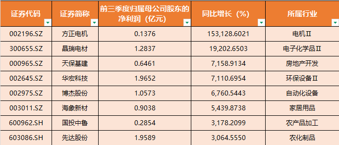 从净利润增幅来看,上述5385家上市公司中,有2325家公司前三季度净利润同比增超10%,1626家公司同比增超30%,677家公司同比增超100%。剔除扭亏影响,方正电机、晶瑞电材、天保基建、华宏科技、博杰股份、海象新材、国投中鲁、先达股份等公司前三季度净利润同比增幅超过3000%。