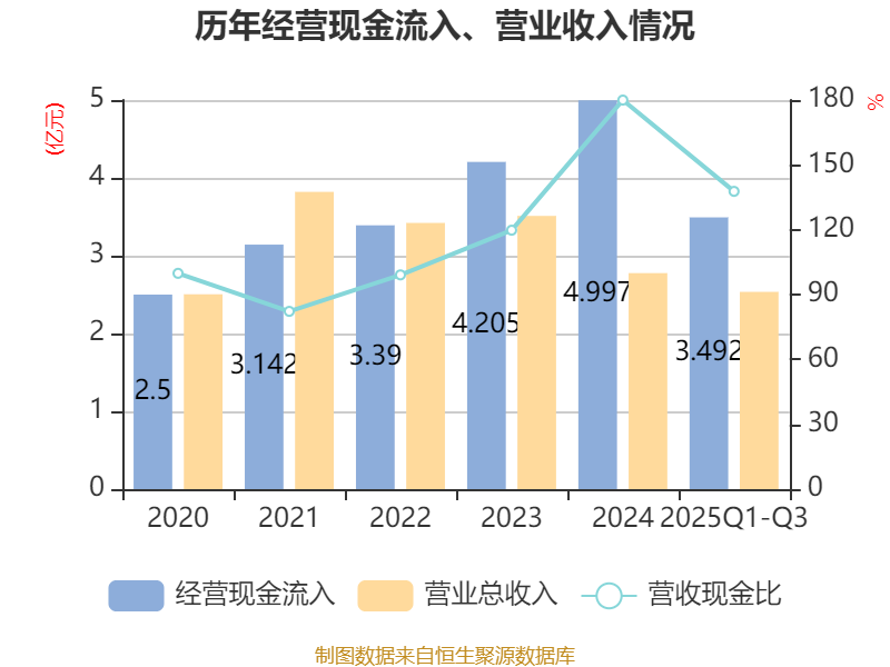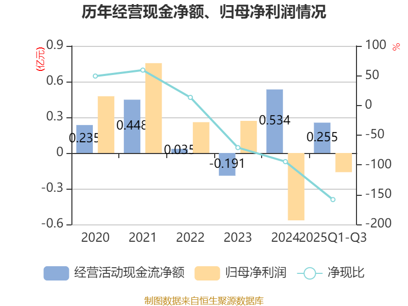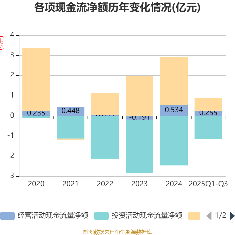 2025年前三季度,公司经营活动现金流净额为2552.33万元,同比下降48.28%;筹资活动现金流净额6315.67万元,同比减少1.45亿元;投资活动现金流净额-1.16亿元,上年同期为-1.99亿元。