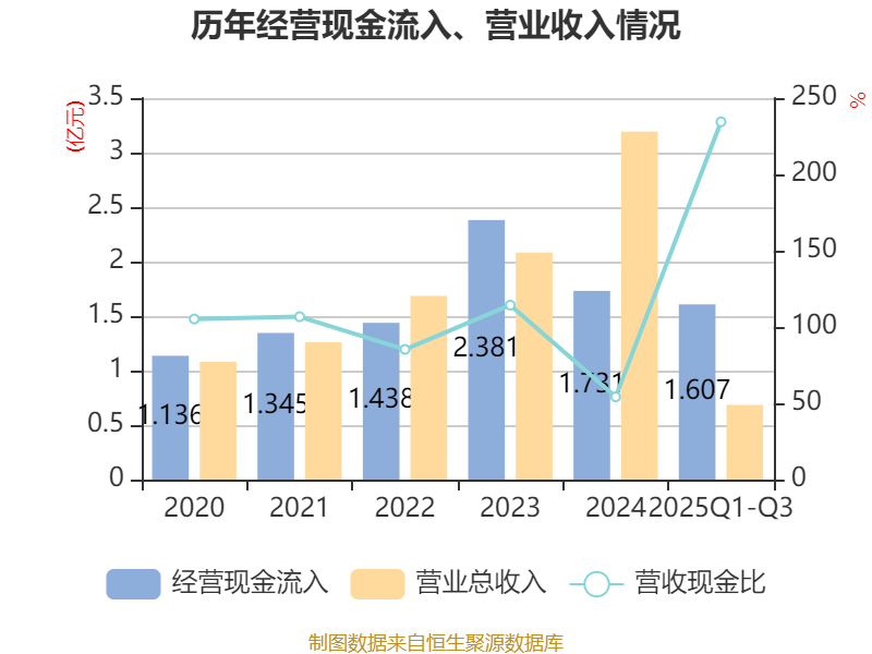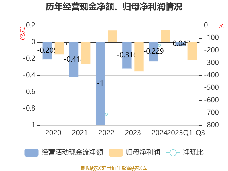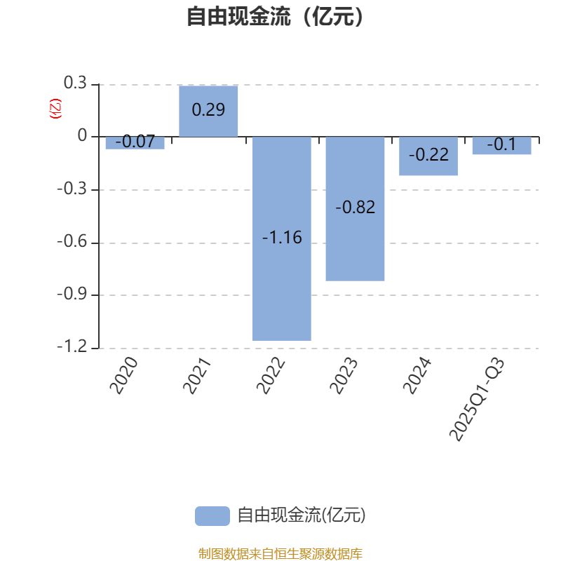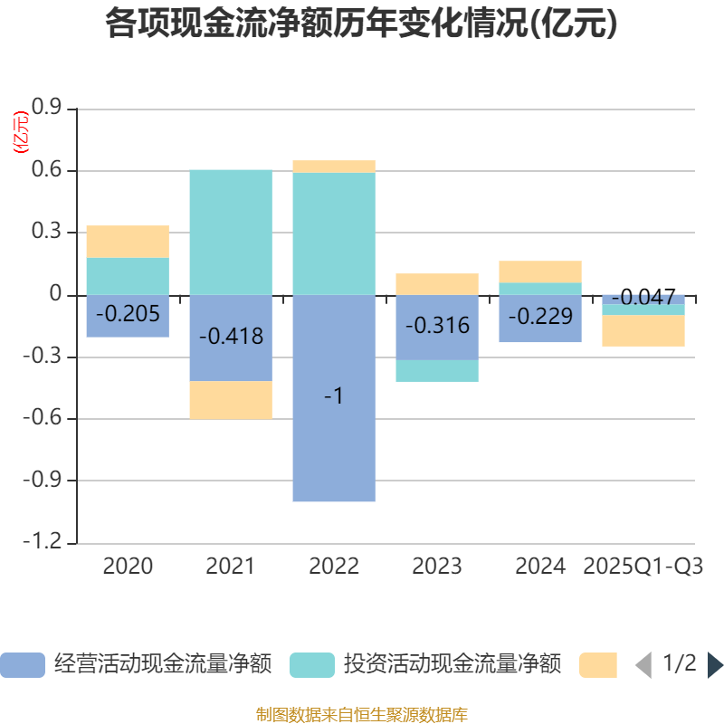 2025年前三季度,公司经营活动现金流净额为-474.08万元,同比增加1872.6万元;筹资活动现金流净额-1514.51万元,同比减少2294.24万元;投资活动现金流净额-521.68万元,上年同期为-573.09万元。