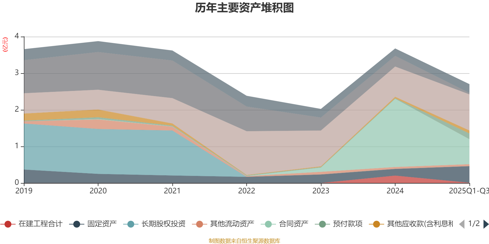 资产重大变化方面,截至2025年三季度末,公司合同资产较上年末减少63.41%,占公司总资产比重下降25.49个百分点;应收票据及应收账款较上年末增加19.36%,占公司总资产比重上升14.05个百分点;固定资产较上年末增加149.23%,占公司总资产比重上升11.81个百分点;货币资金较上年末减少85.94%,占公司总资产比重下降6.43个百分点。