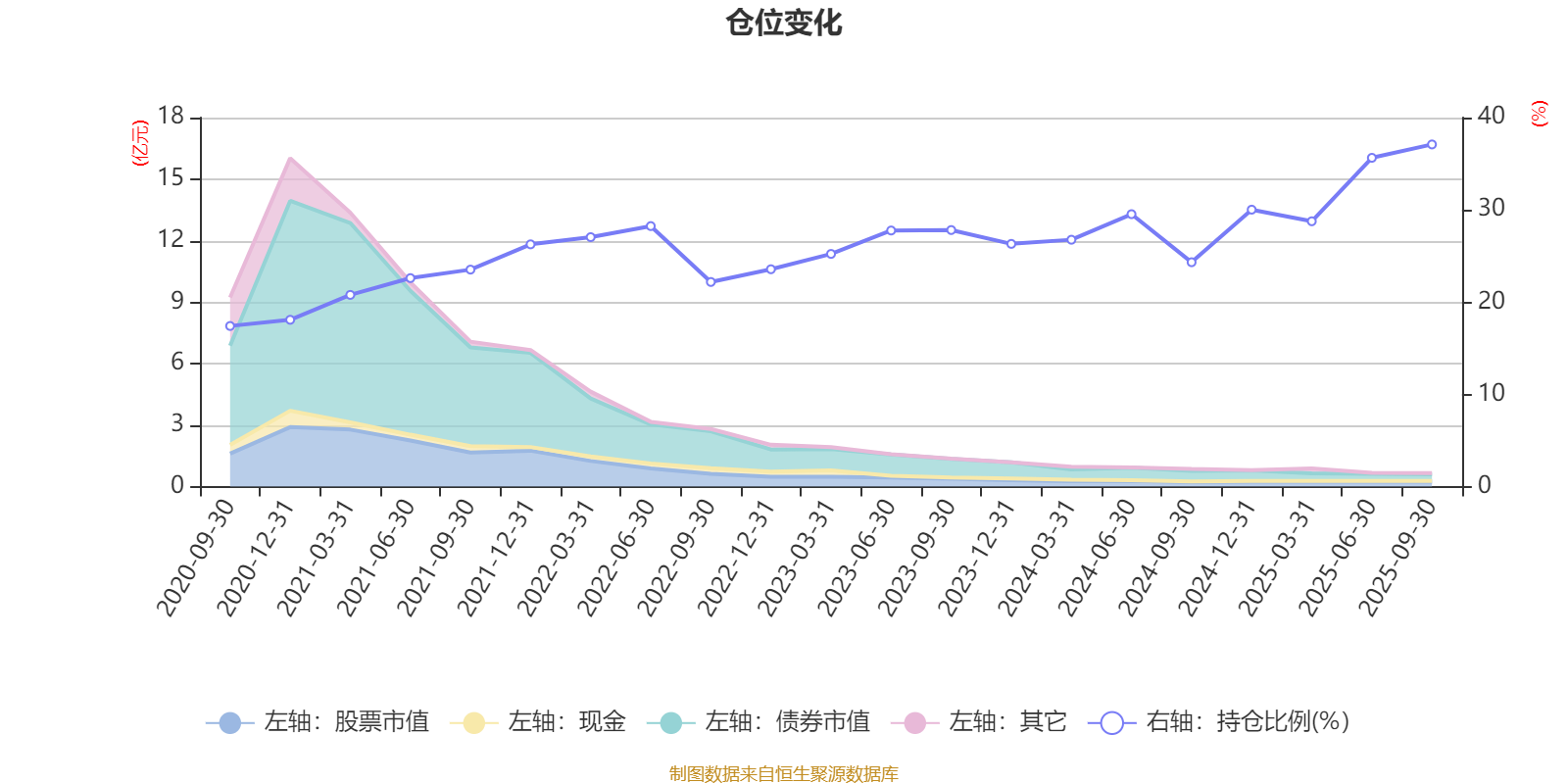 据定期报告数据统计,近三年平均股票仓位为28.57%,同类平均为19.14%。2025年三季度末基金达到37.09%的最高仓位,2020年三季度末最低,为17.41%。