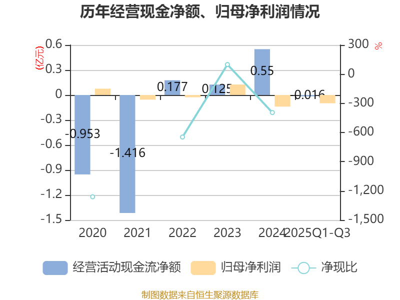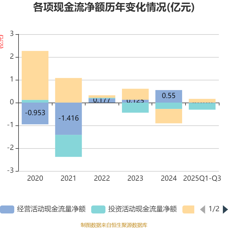 2025年前三季度,公司经营活动现金流净额为-161.5万元,同比增加1082.72万元;筹资活动现金流净额1644.32万元,同比增加3195.96万元;投资活动现金流净额-2943.06万元,上年同期为-975.35万元。